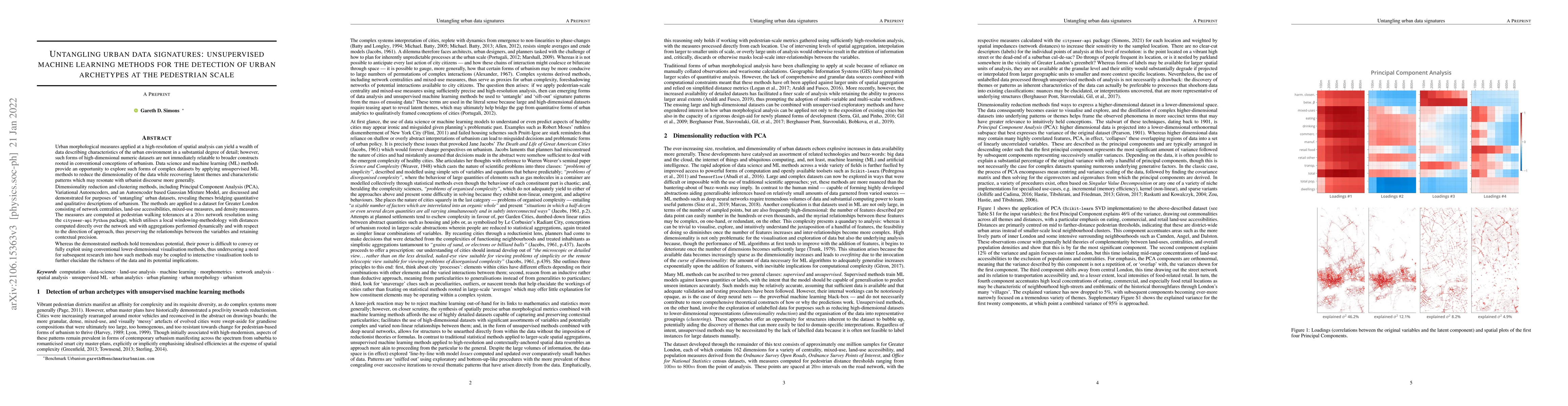 Urban morphological measures applied at a high-resolution of spatial analysis can yield a wealth of data describing characteristics of the urban environment in a substantial degree of detail; however, such forms of high-dimensional numeric datasets are not immediately relatable to broader constructs rooted in conventional conceptions of urbanism. Data science and machine learning (ML) methods provide an opportunity to explore such forms of complex datasets by applying unsupervised ML methods to reduce the dimensionality of the data while recovering latent themes and characteristic patterns which may resonate with urbanist discourse more generally. Dimensionality reduction and clustering methods, including Principal Component Analysis (PCA), Variational Autoencoders, and an Autoencoder based Gaussian Mixture Model, are discussed and demonstrated for purposes of `untangling' urban datasets, revealing themes bridging quantitative and qualitative descriptions of urbanism. The methods are applied to a dataset for Greater London consisting of network centralities, land-use accessibilities, mixed-use measures, and density measures. The measures are computed at pedestrian walking tolerances at a $20m$ network resolution utilising a local windowing-methodology with distances computed directly over the network and with aggregations performed dynamically and with respect to the direction of approach, thus preserving the relationships between the variables and retaining contextual precision. Whereas the demonstrated methods hold tremendous potential, their power is difficult to convey or fully exploit using conventional lower-dimensional visualisation methods, thus underscoring a need for subsequent research into how such methods may be coupled to interactive visualisation tools to further elucidate the richness of the data and its potential implications.