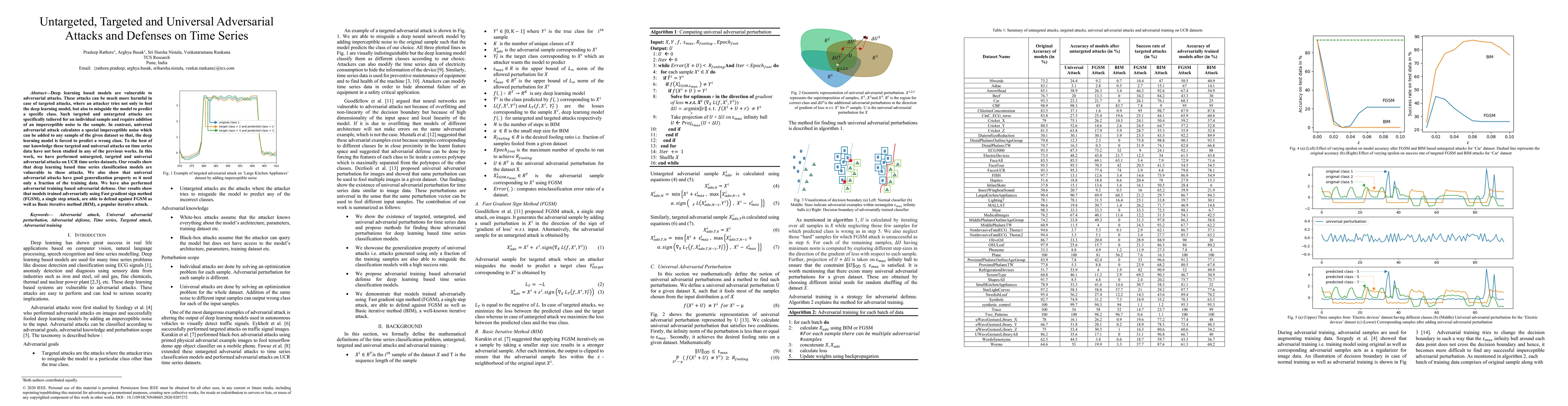 The paper performs untargeted, targeted, and universal adversarial attacks on UCR time series datasets using deep learning models based on the ResNet architecture. Adversarial training is also implemented to increase model robustness.