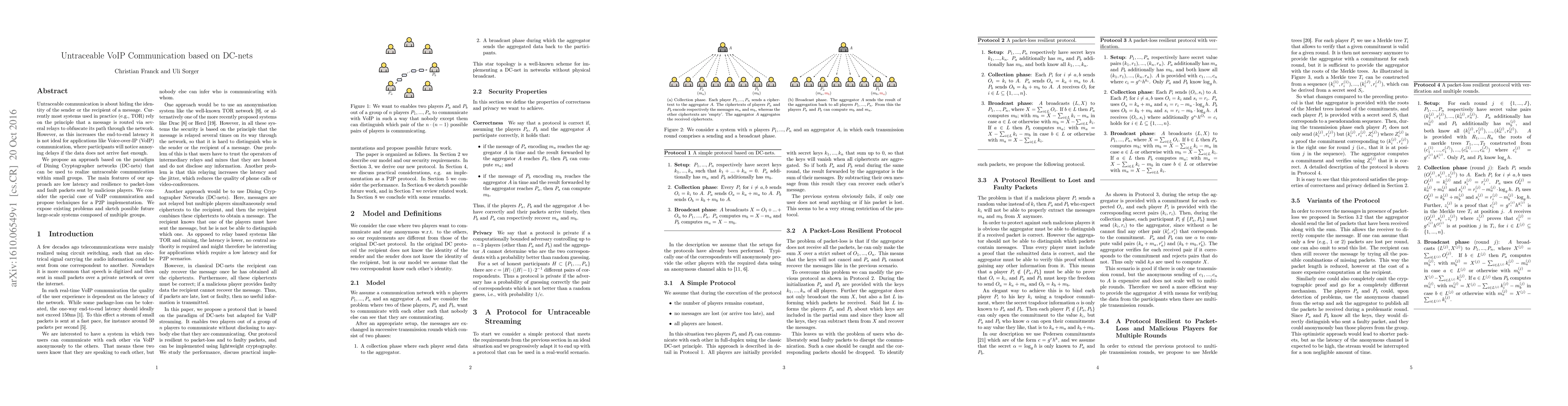This paper proposes an untraceable Voice-over-IP (VoIP) communication method using Dining Cryptographer networks (DC-nets) to minimize latency and enhance resilience against packet loss and malicious interference, suitable for small group communications. Future work may extend this approach to larger-scale systems.