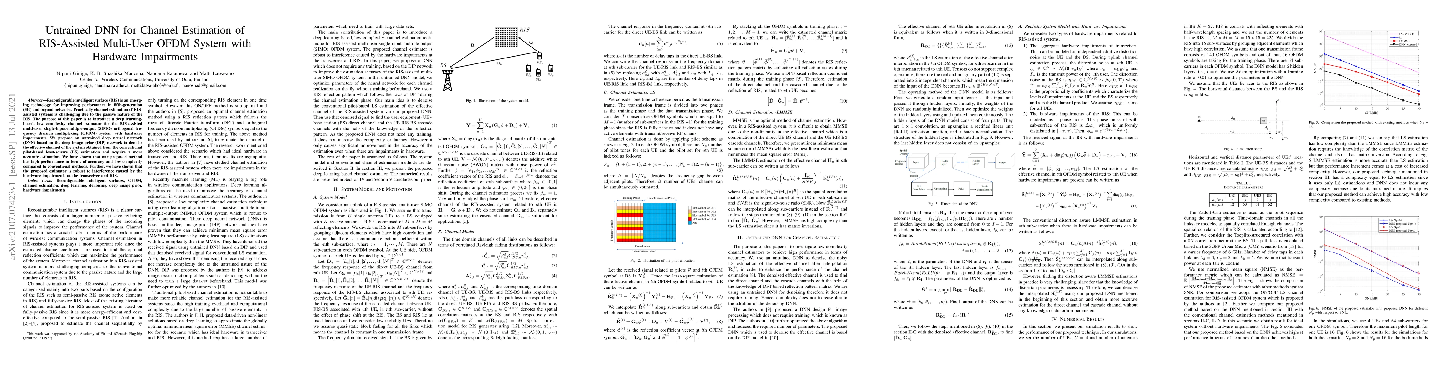 Reconfigurable intelligent surface (RIS) is an emerging technology for improving performance in fifth-generation (5G) and beyond networks. Practically channel estimation of RIS-assisted systems is challenging due to the passive nature of the RIS. The purpose of this paper is to introduce a deep learning-based, low complexity channel estimator for the RIS-assisted multi-user single-input-multiple-output (SIMO) orthogonal frequency division multiplexing (OFDM) system with hardware impairments. We propose an untrained deep neural network (DNN) based on the deep image prior (DIP) network to denoise the effective channel of the system obtained from the conventional pilot-based least-square (LS) estimation and acquire a more accurate estimation. We have shown that our proposed method has high performance in terms of accuracy and low complexity compared to conventional methods. Further, we have shown that the proposed estimator is robust to interference caused by the hardware impairments at the transceiver and RIS.