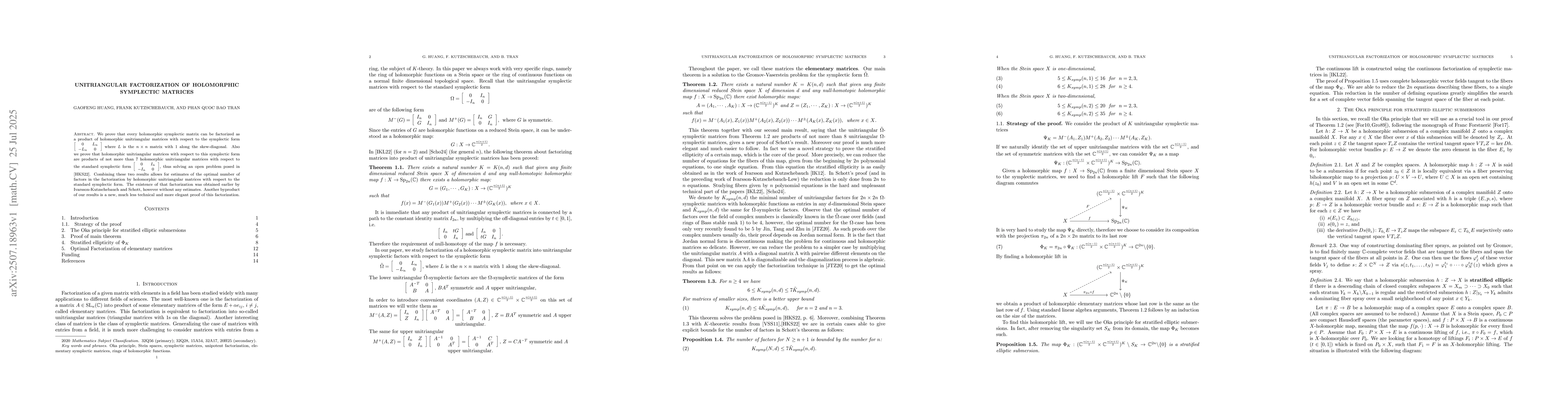 We prove that every holomorphic symplectic matrix can be factorized as a product of holomorphic unitriangular matrices with respect to the symplectic form $ \left[\begin{array}{ccc} 0 & L_n \\ -L_n & 0\end{array}\right]$ where $L$ is the $n \times n$ matrix with $1$ along the skew-diagonal. Also we prove that holomorphic unitriangular matrices with respect to this symplectic form are products of not more than $7$ holomorphic unitriangular matrices with respect to the standard symplectic form $\left[\begin{array}{ccc} 0 & I_n \\ -I_n & 0\end{array}\right]$, thus solving an open problem posed in \cite{HKS}. Combining these two results allows for estimates of the optimal number of factors in the factorization by holomorphic unitriangular matrices with respect to the standard symplectic form. The existence of that factorization was obtained earlier by Ivarsson-Kutzschebauch and Schott, however without any estimates. Another byproduct of our results is a new, much less technical and more elegant proof of this factorization.