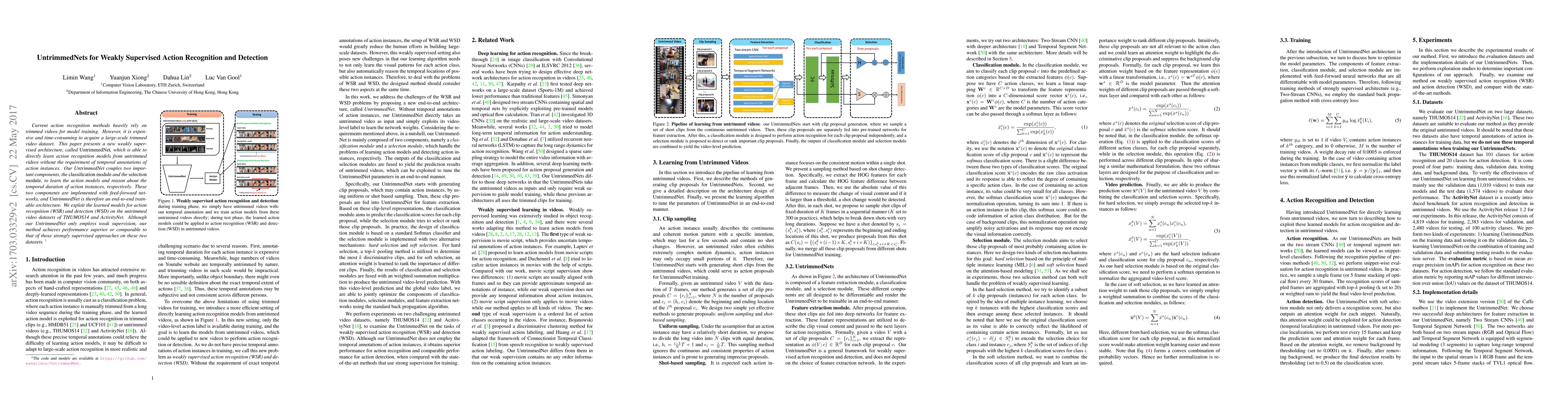 This paper introduces UntrimmedNet, a weakly supervised architecture for action recognition and detection using untrimmed videos, eliminating the need for temporal annotations. The model combines classification and selection modules to learn action models and infer action durations, achieving performance comparable to strongly supervised methods on THUMOS14 and ActivityNet datasets.
