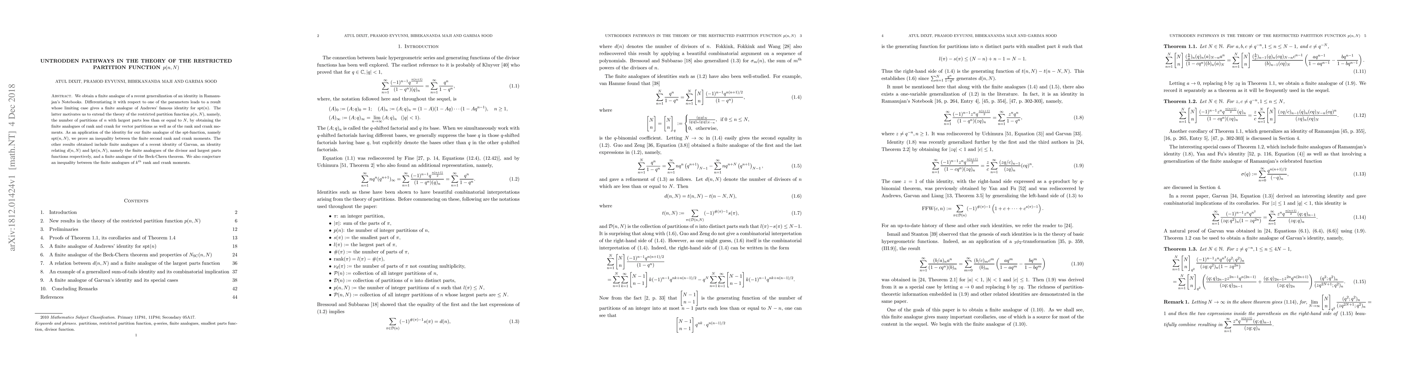 We obtain a finite analogue of a recent generalization of an identity in Ramanujan's Notebooks. Differentiating it with respect to one of the parameters leads to a result whose limiting case gives a finite analogue of Andrews' famous identity for $\textup{spt}(n)$. The latter motivates us to extend the theory of the restricted partition function $p(n, N)$, namely, the number of partitions of $n$ with largest parts less than or equal to $N$, by obtaining the finite analogues of rank and crank for vector partitions as well as of the rank and crank moments. As an application of the identity for our finite analogue of the spt-function, namely $\textup{spt}(n, N)$, we prove an inequality between the finite second rank and crank moments. The other results obtained include finite analogues of a recent identity of Garvan, an identity relating $d(n, N)$ and lpt$(n, N)$, namely the finite analogues of the divisor and largest parts functions respectively, and a finite analogue of the Beck-Chern theorem. We also conjecture an inequality between the finite analogues of $k^{\textup{th}}$ rank and crank moments.