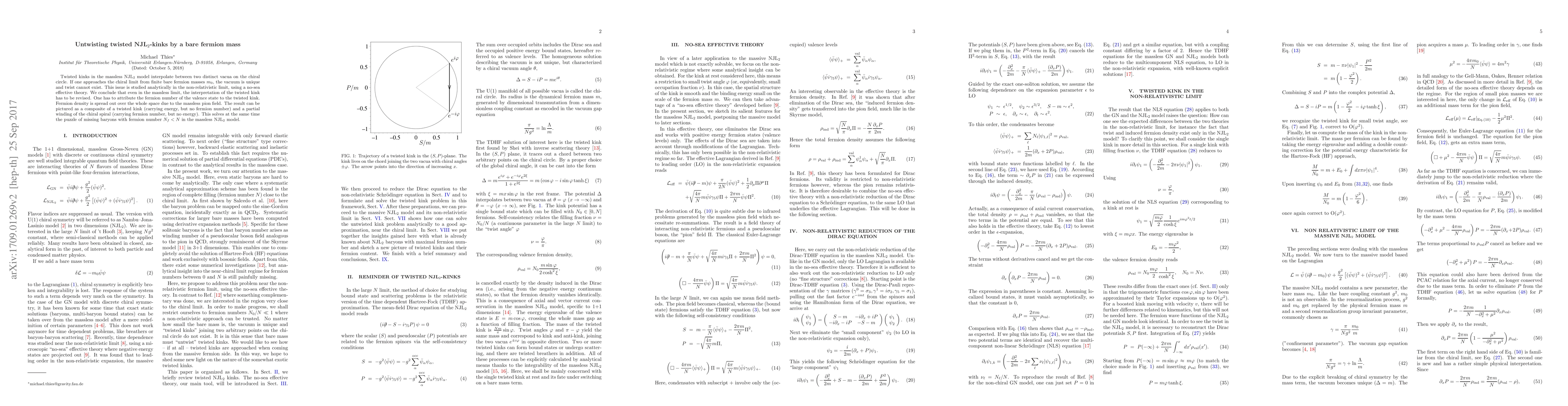 This paper analyzes the behavior of twisted kinks in the massless NJL$_2$ model, revealing that the introduction of a bare fermion mass $m_0$ eliminates the possibility of a twist. It concludes that even in the massless limit, the kink's interpretation must be revised, showing it as a composite of a twisted kink and a partial winding of the chiral spiral.