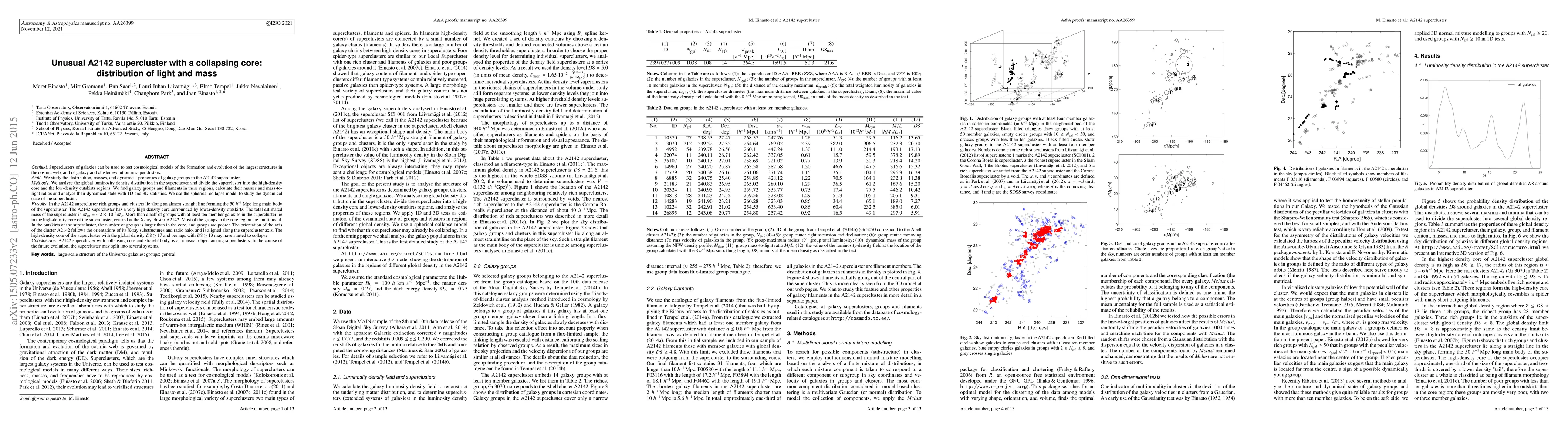 We study the distribution, masses, and dynamical properties of galaxy groups in the A2142 supercluster. We analyse the global luminosity density distribution in the supercluster and divide the supercluster into the high-density core and the low-density outskirts regions. We find galaxy groups and filaments in the regions of different global density, calculate their masses and mass-to-light ratios and analyse their dynamical state with several 1D and 3D statistics. We use the spherical collapse model to study the dynamical state of the supercluster. We show that in A2142 supercluster groups and clusters with at least ten member galaxies lie along an almost straight line forming a 50 Mpc/h long main body of the supercluster. The A2142 supercluster has a very high density core surrounded by lower-density outskirt regions. The total estimated mass of the supercluster is M_est = 6.2 10^{15}M_sun. More than a half of groups with at least ten member galaxies in the supercluster lie in the high-density core of the supercluster, centered at the rich X-ray cluster A2142. Most of the galaxy groups in the core region are multimodal. In the outskirts of the supercluster, the number of groups is larger than in the core, and groups are poorer. The orientation of the cluster A2142 axis follows the orientations of its X-ray substructures and radio halo, and is aligned along the supercluster axis. The high-density core of the supercluster with the global density D8 > 17 and perhaps with D8 > 13 may have reached the turnaround radius and started to collapse. A2142 supercluster with luminous, collapsing core and straight body is an unusual object among galaxy superclusters. In the course of the future evolution the supercluster may be split into several separate systems.