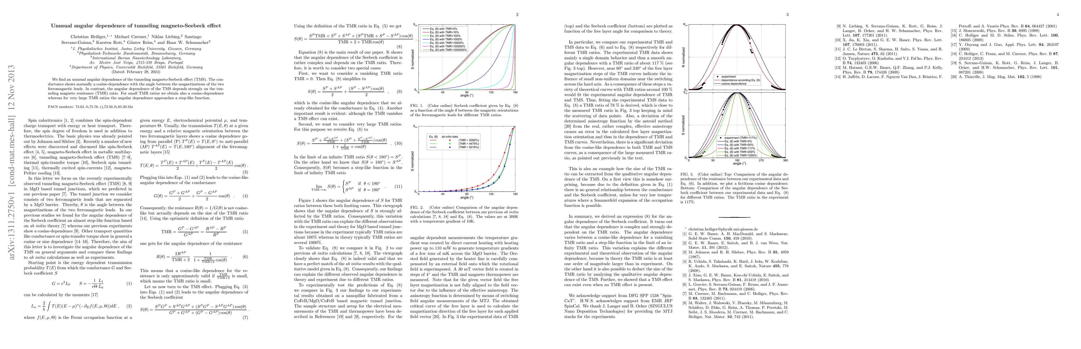 This paper investigates the tunneling magneto-Seebeck effect (TMS) and finds an unusual angular dependence that varies with the tunneling magnetoresistance (TMR) ratio, transitioning from a cosine-like to a step-like function as TMR increases.
