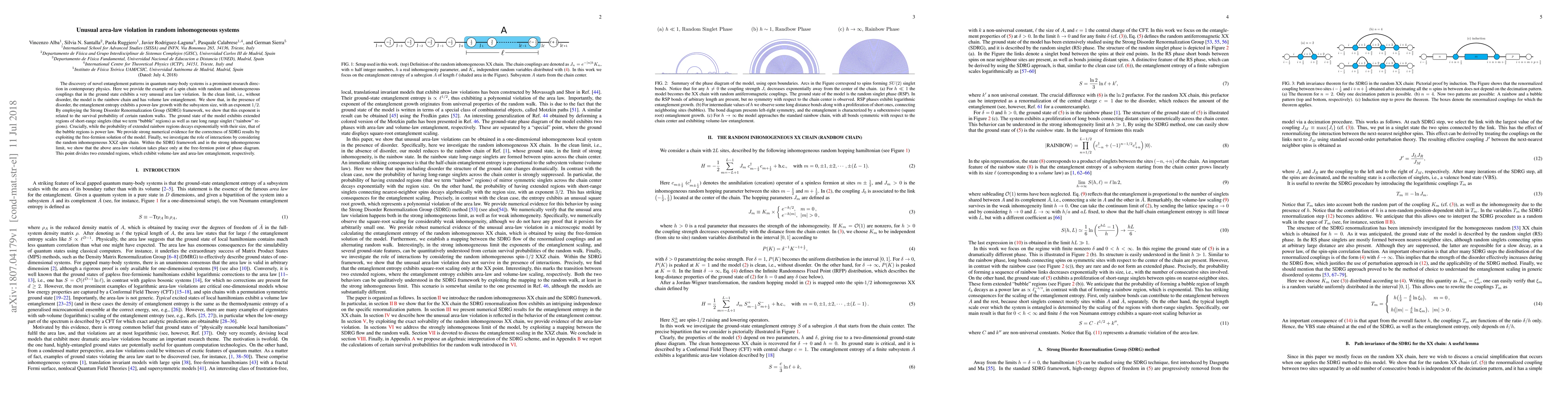 This paper investigates a spin chain with random and inhomogeneous couplings, revealing an unusual area law violation in its entanglement entropy, characterized by a power-law growth with subsystem size. The study employs the Strong Disorder Renormalization Group framework to link this behavior to the survival probability of random walks, identifying distinct "bubble" and "rainbow" regions in the ground state.
