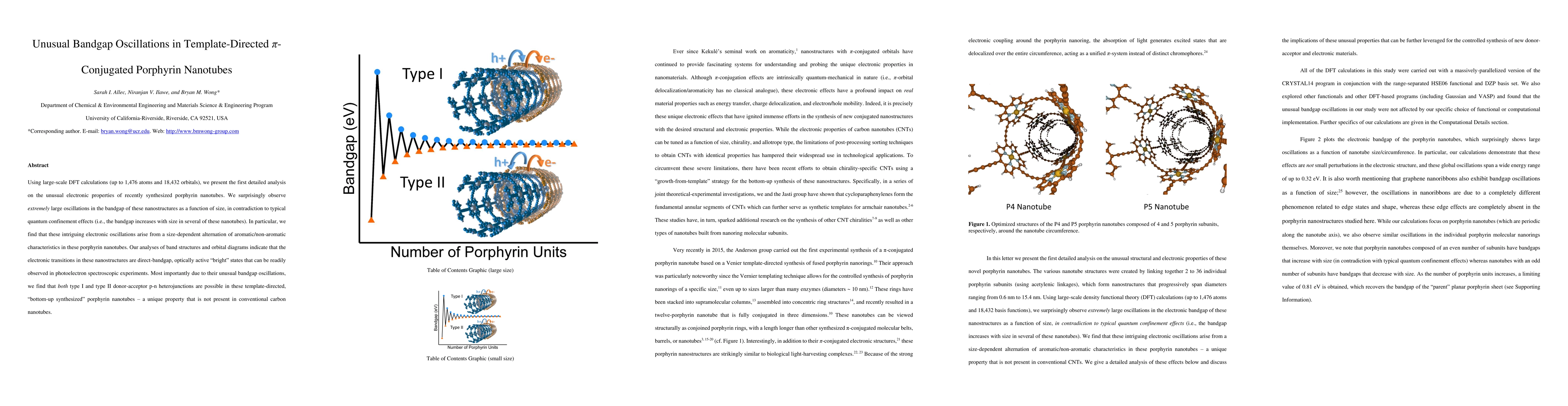 This study reveals unusual bandgap oscillations in template-directed porphyrin nanotubes, contrary to typical quantum confinement effects. The oscillations arise from a size-dependent alternation of aromatic/non-aromatic characteristics, enabling both type I and type II p-n heterojunctions.