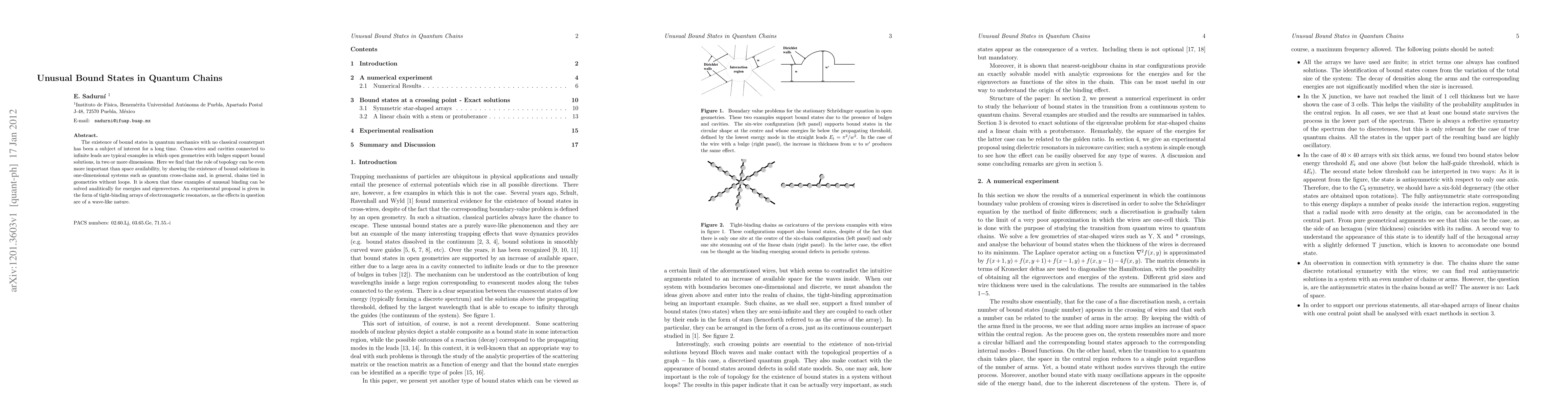 The existence of bound states in quantum mechanics with no classical counterpart has been a subject of interest for a long time. Cross-wires and cavities connected to infinite leads are typical examples in which open geometries with bulges support bound solutions, in two or more dimensions. Here we find that the role of topology can be even more important than space availability, by showing the existence of bound solutions in one-dimensional systems such as quantum cross-chains and, in general, chains tied in geometries without loops. It is shown that these examples of unusual binding can be solved analitically for energies and eigenvectors. An experimental proposal is given in the form of tight-binding arrays of electromagnetic resonators, as the effects in question are of a wave-like nature.