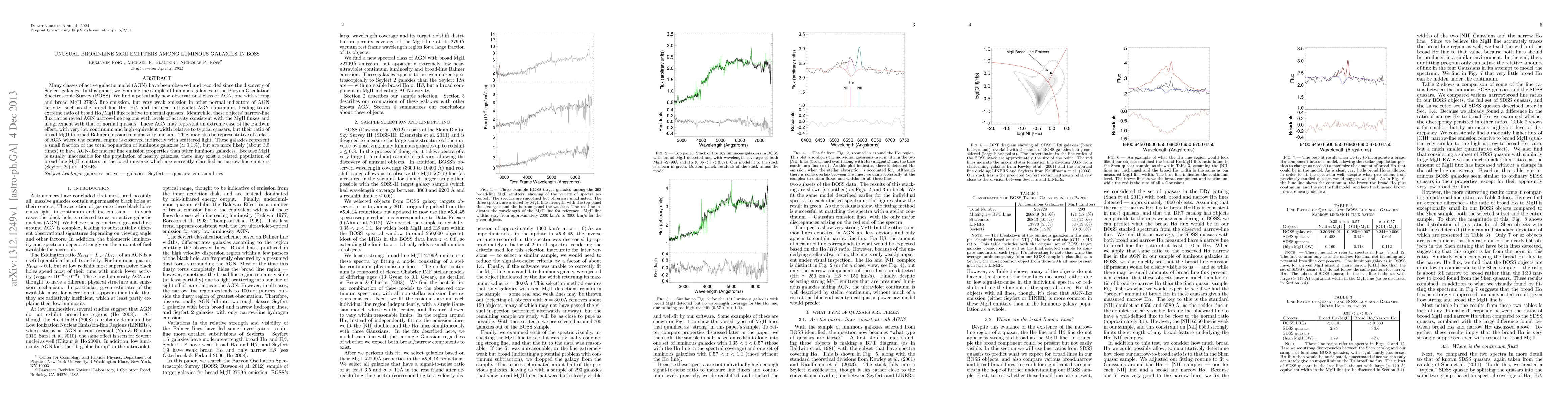 This paper identifies a unique class of active galactic nuclei (AGN) in luminous galaxies from the BOSS survey, characterized by strong and broad MgII emission but weak emission in other AGN indicators, suggesting an extreme Baldwin effect or indirect observation of the central AGN engine. These rare galaxies, comprising about 0.1% of luminous galaxies, may represent a broader population of nearby AGN misclassified as narrow-line emitters.
