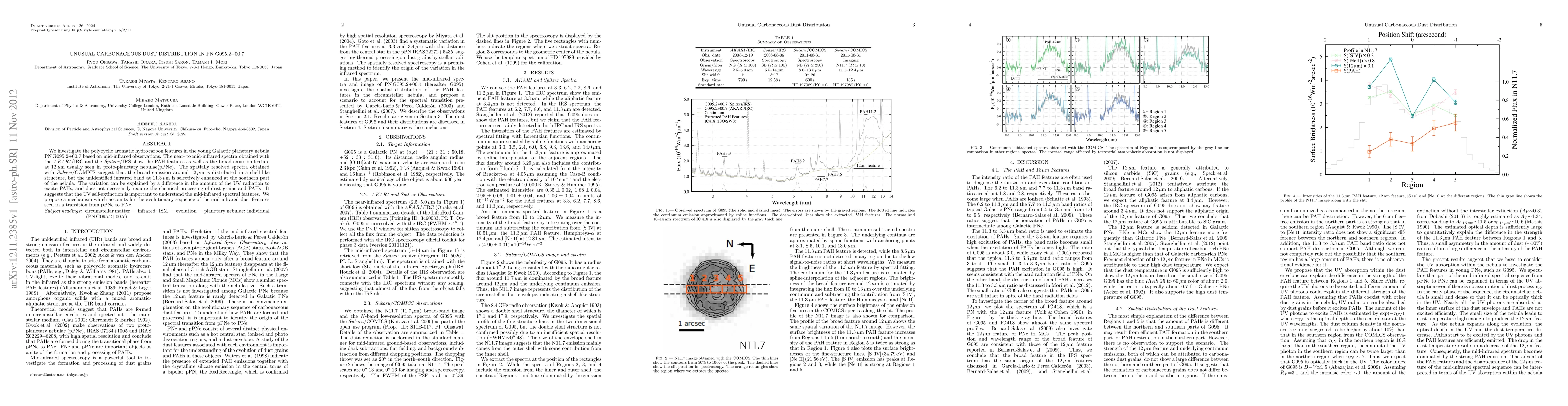 We investigate the polycyclic aromatic hydrocarbon features in the young Galactic planetary nebula PN G095.2+00.7 based on mid-infrared observations. The near- to mid-infrared spectra obtained with the AKARI/IRC and the Spitzer/IRS show the PAH features as well as the broad emission feature at 12 {\mu}m usually seen in proto-planetary nebulae (pPNe). The spatially resolved spectra obtained with Subaru/COMICS suggest that the broad emission around 12 {\mu}m is distributed in a shell-like structure, but the unidentified infrared band at 11.3 {\mu}m is selectively enhanced at the southern part of the nebula. The variation can be explained by a difference in the amount of the UV radiation to excite PAHs, and does not necessarily require the chemical processing of dust grains and PAHs. It suggests that the UV self-extinction is important to understand the mid-infrared spectral features. We propose a mechanism which accounts for the evolutionary sequence of the mid-infrared dust features seen in a transition from pPNe to PNe.