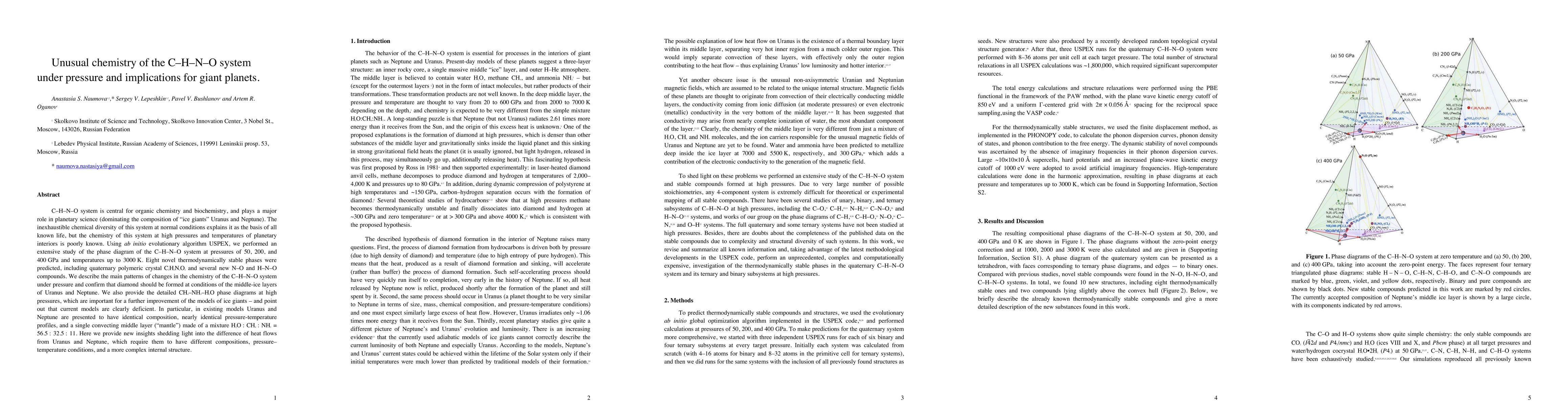 Researchers used ab initio evolutionary algorithm to study C-H-N-O chemistry under high pressure and temperature conditions, predicting 8 new thermodynamically stable phases, including diamond formation in Uranus and Neptune's middle layers.