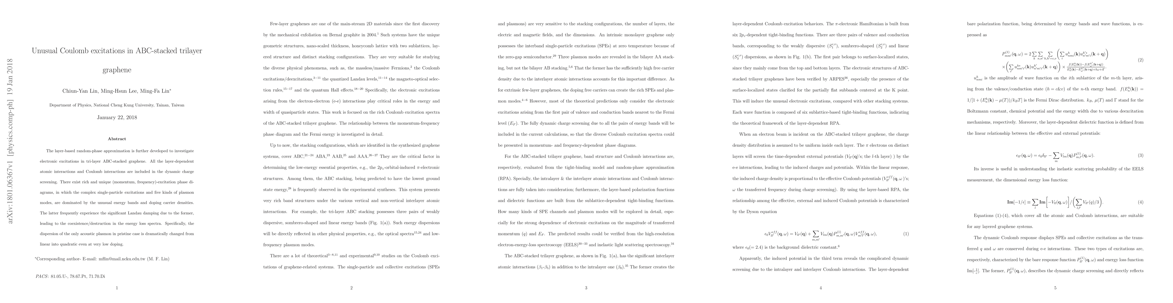This paper develops a layer-based random-phase approximation to study electronic excitations in trilayer ABC-stacked graphene, revealing unique (momentum, frequency)-excitation phase diagrams dominated by unusual energy bands and doping carrier densities, which cause significant Landau damping and dramatic changes in the acoustic plasmon dispersion.