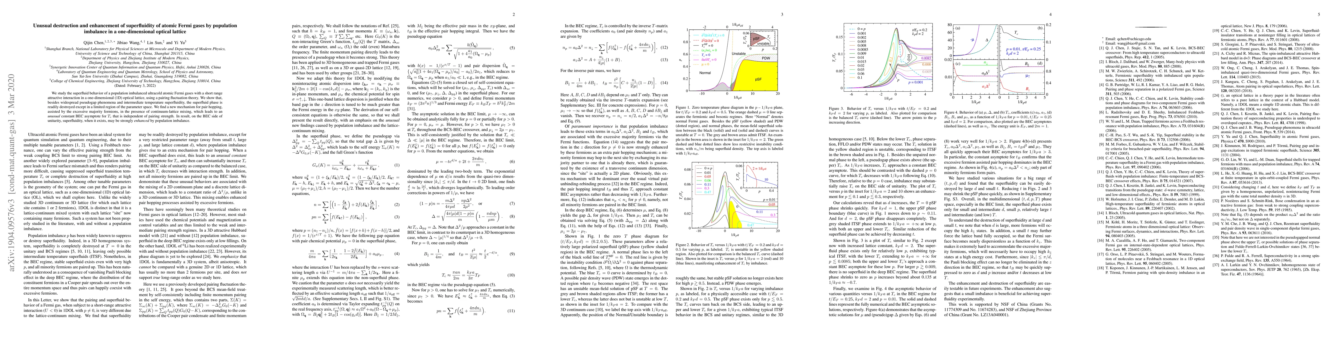 This paper explores the superfluid behavior of ultracold Fermi gases in a 1D optical lattice, revealing that population imbalance can both destroy and enhance superfluidity. It identifies a new pair hopping mechanism that leads to an unusual constant critical temperature independent of pairing strength, suggesting strong enhancement of superfluidity under certain conditions.