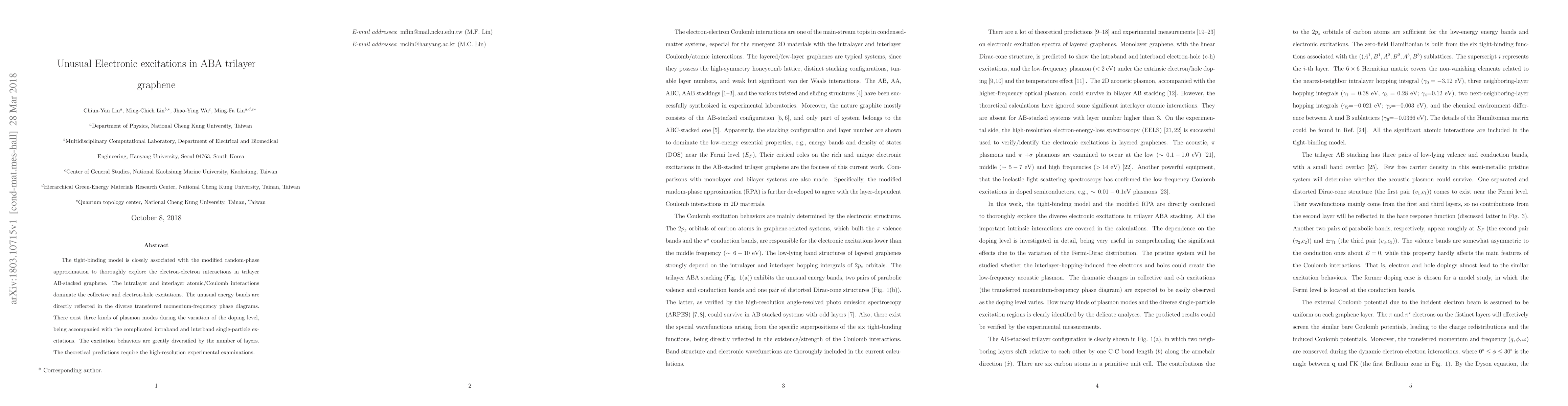 This paper investigates electron-electron interactions in trilayer AB-stacked graphene using a tight-binding model and modified random-phase approximation, revealing unusual electronic excitations and diverse plasmon modes influenced by doping levels and layer interactions. Experimental validation of these theoretical predictions is recommended.