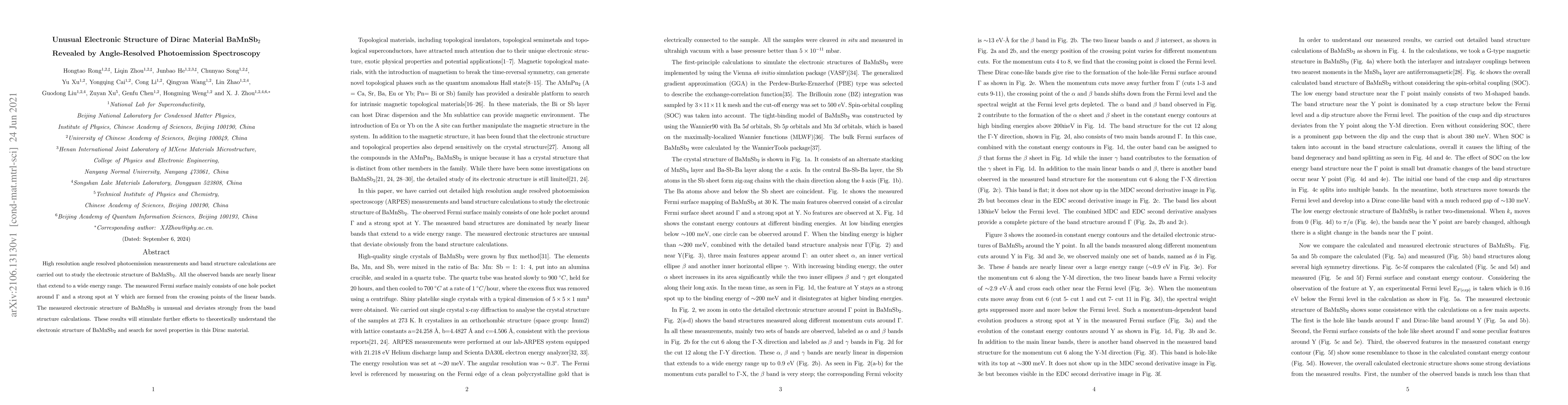 High-resolution angle-resolved photoemission reveals unusual nearly linear bands in BaMnSb$_2$, deviating from calculated band structure, highlighting a hole pocket Fermi surface and challenging existing theoretical models. Further theoretical exploration and potential novel properties in this Dirac material are now warranted.