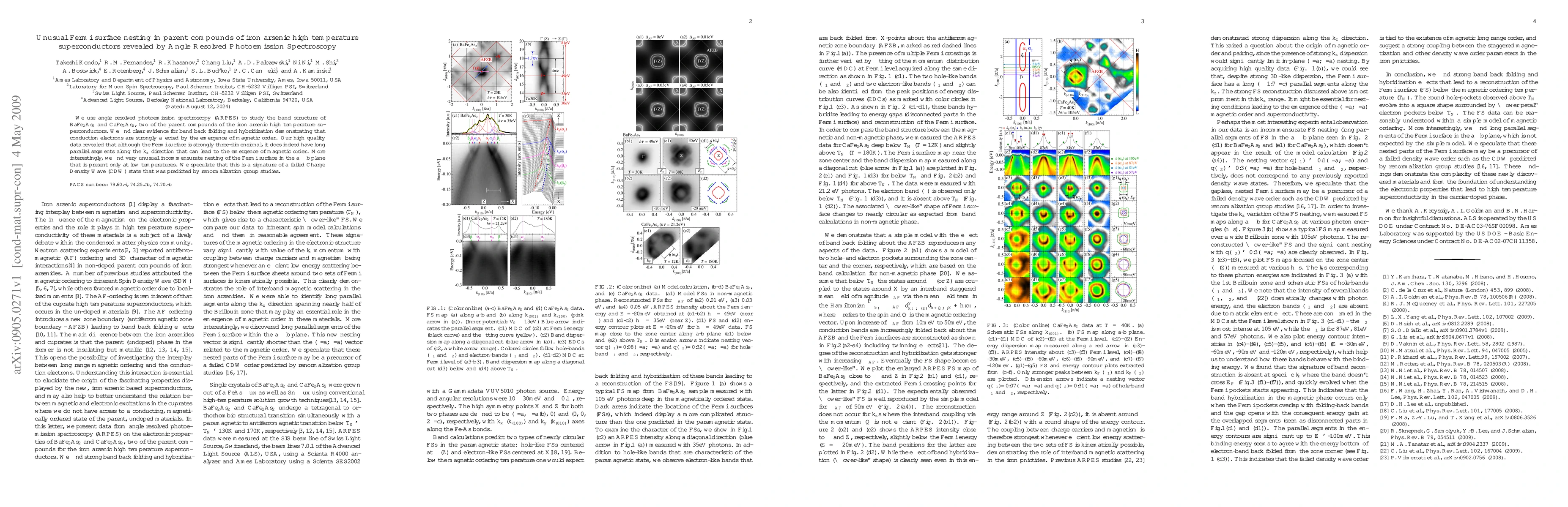We use angle resolved photoemission spectroscopy (ARPES) to study the band structure of BaFe2As2 and CaFe2As2, two of the parent compounds of the iron arsenic high temperature superconductors. We find clear evidence for band back folding and hybridization demonstrating that conduction electrons are strongly affected by the emergence of magnetic order. Our high quality data revealed that although the Fermi surface is strongly three-dimensional, it does indeed have long parallel segments along the kz direction that can lead to the emergence of magnetic order. More interestingly, we find very unusual incommensurate nesting of the Fermi surface in the a-b plane that is present only at low temperatures. We speculate that this is a signature of a failed Charge Density Wave (CDW) state that was predicted by renormalization group studies.
