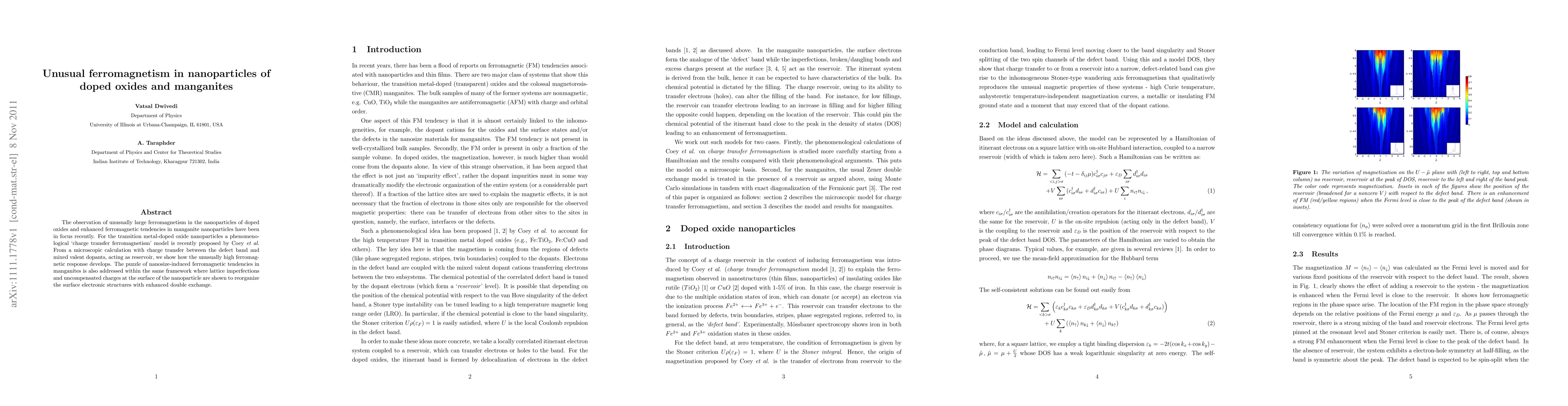 This paper investigates the unusually large ferromagnetism in nanoparticles of doped oxides and manganites, proposing a "charge transfer ferromagnetism" model to explain the phenomenon. It also addresses the nanosize-induced ferromagnetic tendencies in manganites, attributing them to lattice imperfections and uncompensated surface charges enhancing double exchange.