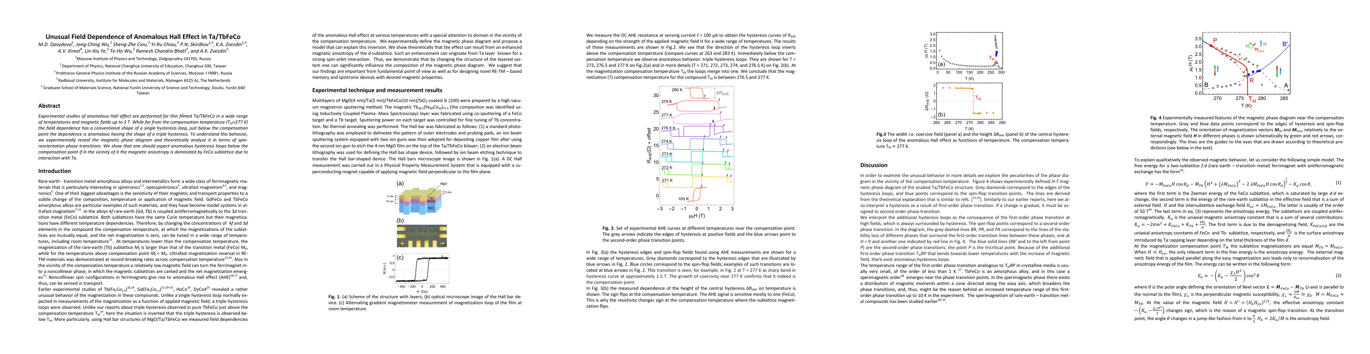 Researchers studied Ta/TbFeCo thin films for anomalous Hall effect in high magnetic fields, finding unusual triple hysteresis loops below compensation temperature.
