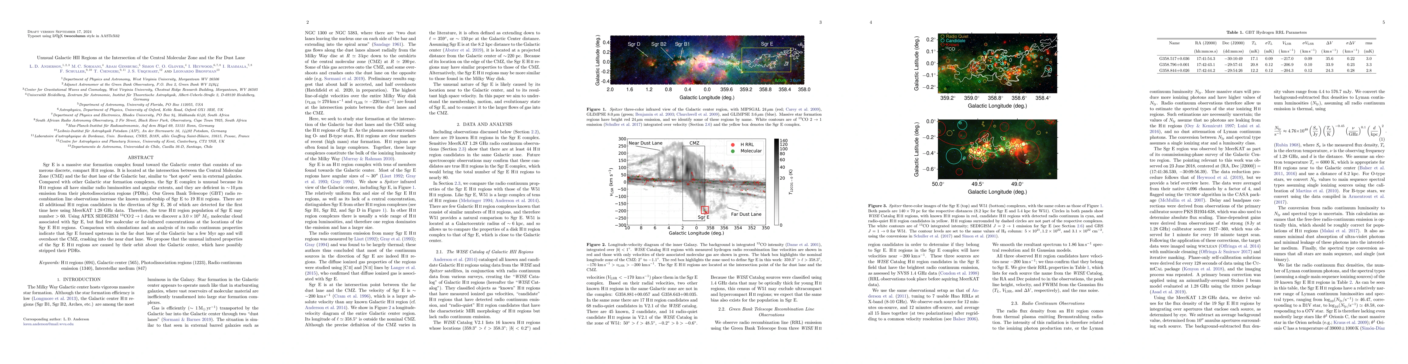 Sgr E is a massive star formation complex found toward the Galactic center that consists of numerous discrete, compact HII regions. It is located at the intersection between the Central Molecular Zone (CMZ) and the far dust lane of the Galactic bar, similar to "hot spots" seen in external galaxies. Compared with other Galactic star formation complexes, the Sgr E complex is unusual because its HII regions all have similar radio luminosities and angular extents, and they are deficient in ~10micron emission from their photodissociation regions (PDRs). Our Green Bank Telescope (GBT) radio recombination line observations increase the known membership of Sgr E to 19 HII regions. There are 43 additional HII region candidates in the direction of Sgr E, 26 of which are detected for the first time here using MeerKAT 1.28GHz data. Therefore, the true HII region population of Sgr E may number >60. Using APEX SEDIGISM 13CO 2-1 data we discover a 3.0x10^5 Solar mass molecular cloud associated with Sgr E, but find few molecular or far-infrared concentrations at the locations of the Sgr E HII regions. Comparison with simulations and an analysis of its radio continuum properties indicate that Sgr E formed upstream in the far dust lane of the Galactic bar a few Myr ago and will overshoot the CMZ, crashing into the near dust lane. We propose that the unusual infrared properties of the Sgr E HII regions are caused by their orbit about the Galactic center, which have possibly stripped their PDRs.