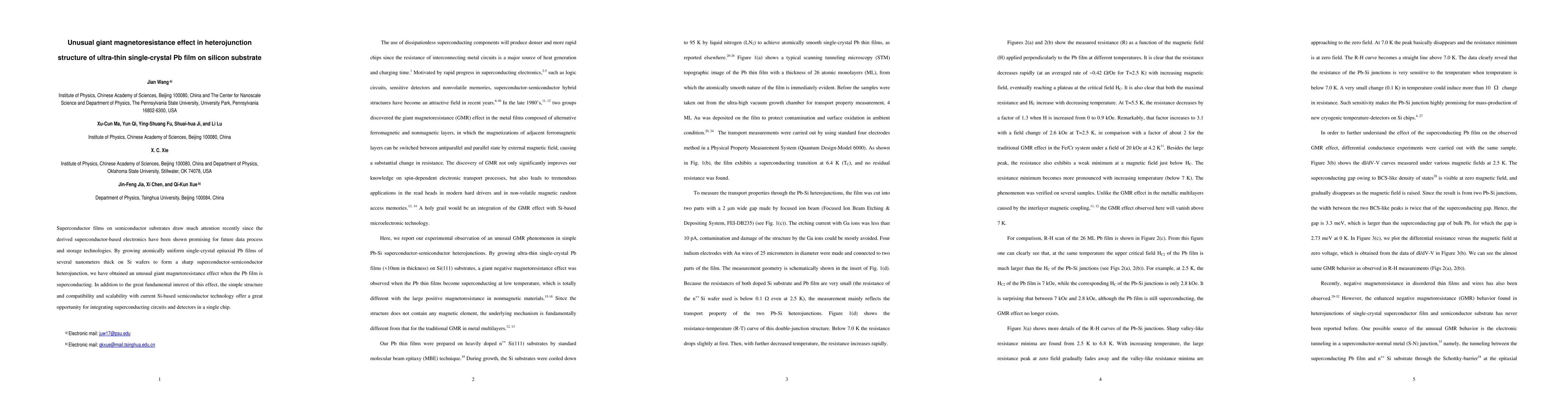 Superconductor films on semiconductor substrates draw much attention recently since the derived superconductor-based electronics have been shown promising for future data process and storage technologies. By growing atomically uniform single-crystal epitaxial Pb films of several nanometers thick on Si wafers to form a sharp superconductor-semiconductor heterojunction, we have obtained an unusual giant magnetoresistance effect when the Pb film is superconducting. In addition to the great fundamental interest of this effect, the simple structure and compatibility and scalability with current Si-based semiconductor technology offer a great opportunity for integrating superconducting circuits and detectors in a single chip.