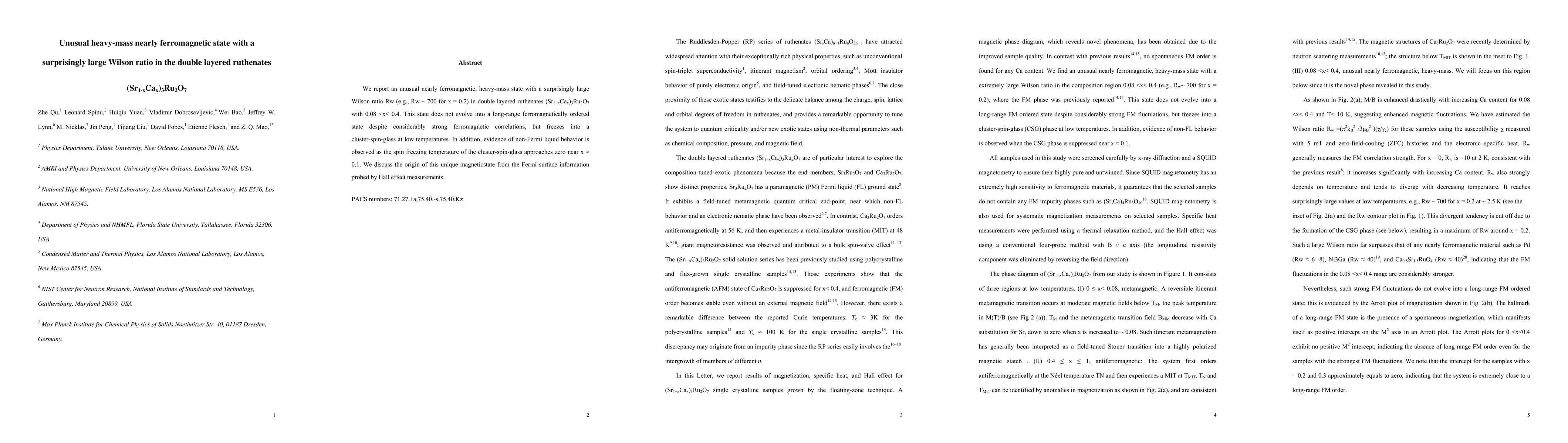 We report an unusual nearly ferromagnetic, heavy-mass state with a surprisingly large Wilson ratio $R_{\textrm{w}}$ (e.g., $R_{\textrm{w}}\sim$ 700 for $x =$ 0.2) in double layered ruthenates (Sr$_{1-x}$Ca$_{x}$)$_{3}$Ru$_{2}$O$_{7}$ with 0.08 $< x <$ 0.4. This state does not evolve into a long-range ferromagnetically ordered state despite considerably strong ferromagnetic correlations, but freezes into a cluster-spin-glass at low temperatures. In addition, evidence of non-Fermi liquid behavior is observed as the spin freezing temperature of the cluster-spin-glass approaches zero near $x \approx$ 0.1. We discuss the origin of this unique magnetic state from the Fermi surface information probed by Hall effect measurements.