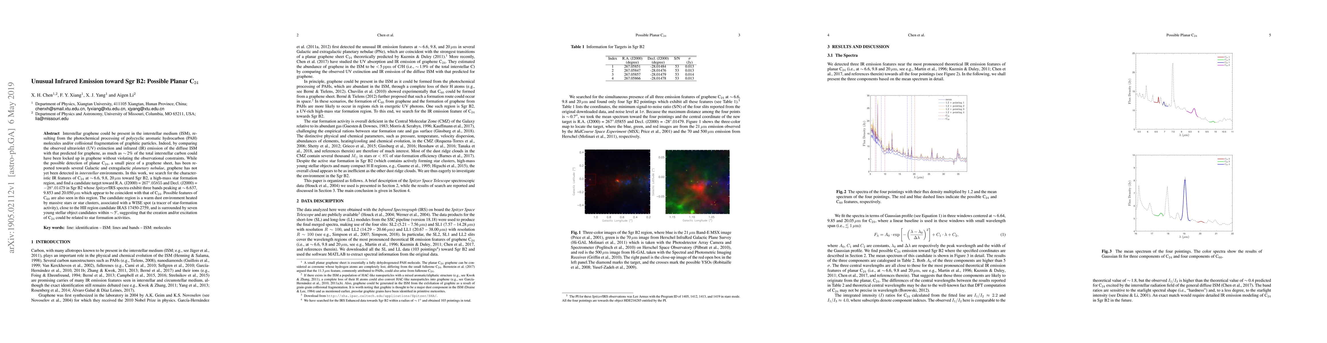 Interstellar graphene could be present in the interstellar medium (ISM), resulting from the photochemical processing of polycyclic aromatic hydrocarbon (PAH) molecules and/or collisional fragmentation of graphitic particles. Indeed, by comparing the observed ultraviolet (UV) extinction and infrared (IR) emission of the diffuse ISM with that predicted for graphene, as much as $\sim$ 2% of the total interstellar carbon could have been locked up in graphene without violating the observational constraints. While the possible detection of planar C$_{24}$, a small piece of a graphene sheet, has been reported towards several Galactic and extragalactic planetary nebulae, graphene has not yet been detected in interstellar environments. In this work, we search for the characteristic IR features of C$_{24}$ at $\sim$ 6.6, 9.8, 20 $\mu m$ toward Sgr B2, a high-mass star formation region, and find a candidate target toward R.A. (J2000) = $267^{\circ}.05855$ and Decl. (J2000) = $-28^{\circ}.01479$ in Sgr B2 whose Spitzer/IRS spectra exhibit three bands peaking at $\sim$ 6.637, 9.853 and 20.050 $\mu m$ which appear to be coincident with that of C$_{24}$. Possible features of C$_{60}$ are also seen in this region. The candidate region is a warm dust environment heated by massive stars or star clusters, associated with a WISE spot (a tracer of star-formation activity), close to the HII region candidate IRAS 17450-2759, and is surrounded by seven young stellar object candidates within $\sim$ 5$^{\prime}$, suggesting that the creation and/or excitation of C$_{24}$ could be related to star formation activities.