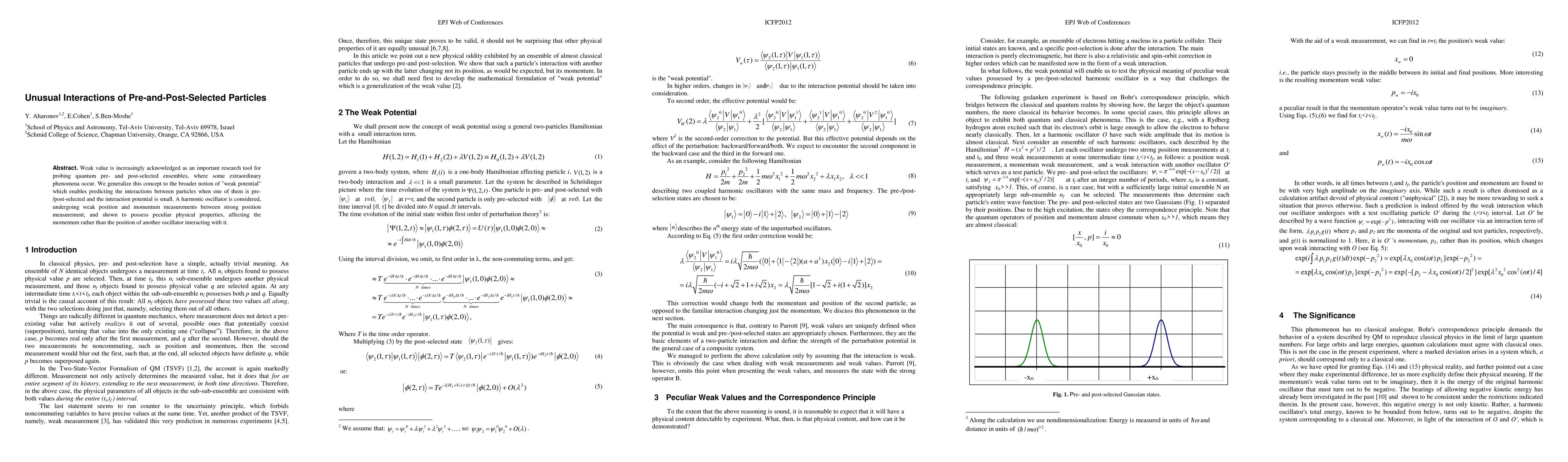 This paper explores the concept of "weak potential" to predict interactions between pre- and post-selected particles, demonstrating unusual effects in a harmonic oscillator system where weak measurements influence the momentum rather than the position of another interacting oscillator.