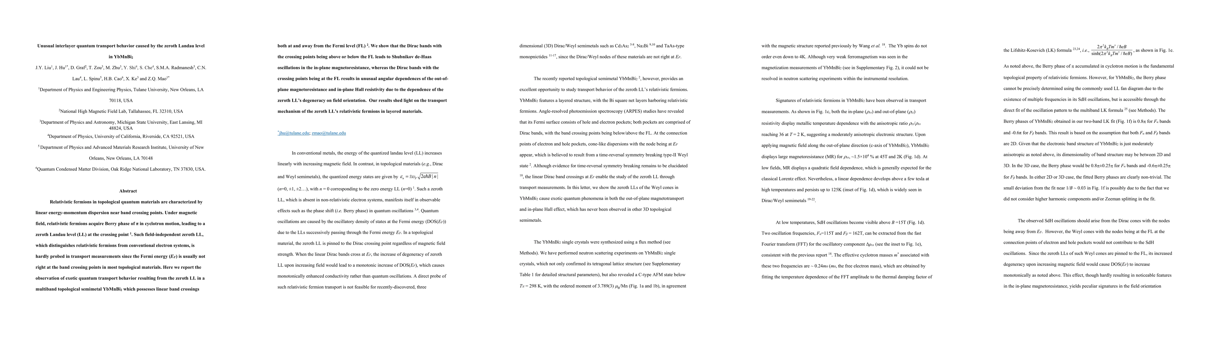 Relativistic fermions in topological quantum materials are characterized by linear energy-momentum dispersion near band crossing points. Under magnetic field, relativistic fermions acquire Berry phase of {\pi} in cyclotron motion, leading to a zeroth Landau level (LL) at the crossing point. Such field-independent zeroth LL, which distinguishes relativistic fermions from conventional electron systems, is hardly probed in transport measurements since the Fermi energy (EF) is usually not right at the band crossing points in most topological materials. Here we report the observation of exotic quantum transport behavior resulting from the zeroth LL in a multiband topological semimetal YbMnBi2 which possesses linear band crossings both at and away from the Fermi level (FL). We show that the Dirac bands with the crossing points being above or below the FL leads to Shubnikov de-Haas oscillations in the in-plane magnetoresistance, whereas the Dirac bands with the crossing points being at the FL results in unusual angular dependences of the out-of-plane magnetoresistance and in-plane Hall resistivity due to the dependence of the zeroth LL's degeneracy on field orientation. Our results shed light on the transport mechanism of the zeroth LL's relativistic fermions in layered materials.