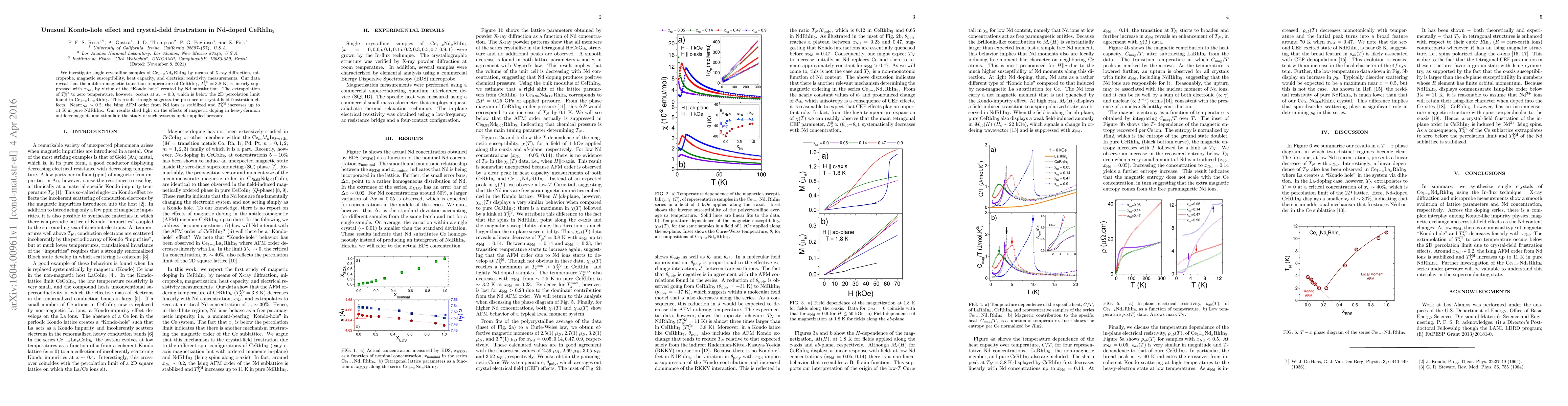 This study investigates Nd-doped CeRhIn$_{5}$ and finds that Nd substitution suppresses the antiferromagnetic transition temperature, revealing a Kondo-hole effect. Crystal-field frustration is suggested by the suppression occurring below the 2D percolation limit, with Nd ions stabilizing Ising AFM order at higher doping levels.