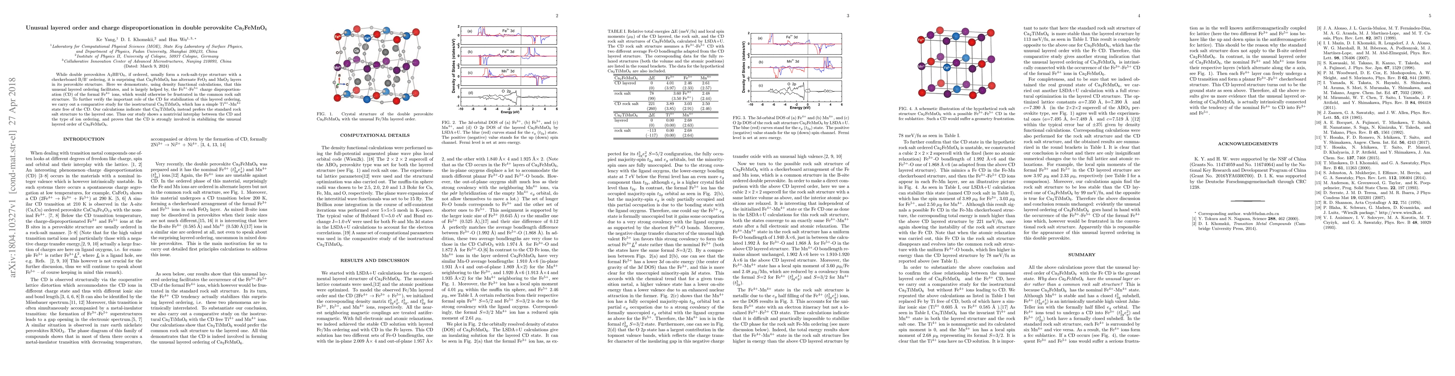 While double perovskites A2BB'O6, if ordered, usually form a rock-salt-type structure with a checkerboard B/B' ordering, it is surprising that Ca2FeMnO6 has alternate FeO2 and MnO2 layers in its perovskite structure. Here we demonstrate, using density functional calculations, that this unusual layered ordering facilitates, and is largely helped by, the Fe3+-Fe5+ charge disproportionation (CD) of the formal Fe4+ ions, which would otherwise be frustrated in the common rock salt structure. To further verify the important role of the CD for stabilization of this layered ordering, we carry out a comparative study for the isostructural Ca2TiMnO6 which has a simple Ti4+-Mn4+ state free of the CD. Our calculations indicate that Ca2TiMnO6 instead prefers the standard rock salt structure to the layered one. Thus our study shows a nontrivial interplay between the CD and the type of ion ordering, and proves that the CD is strongly involved in stabilizing the unusual layered order of Ca2FeMnO6.