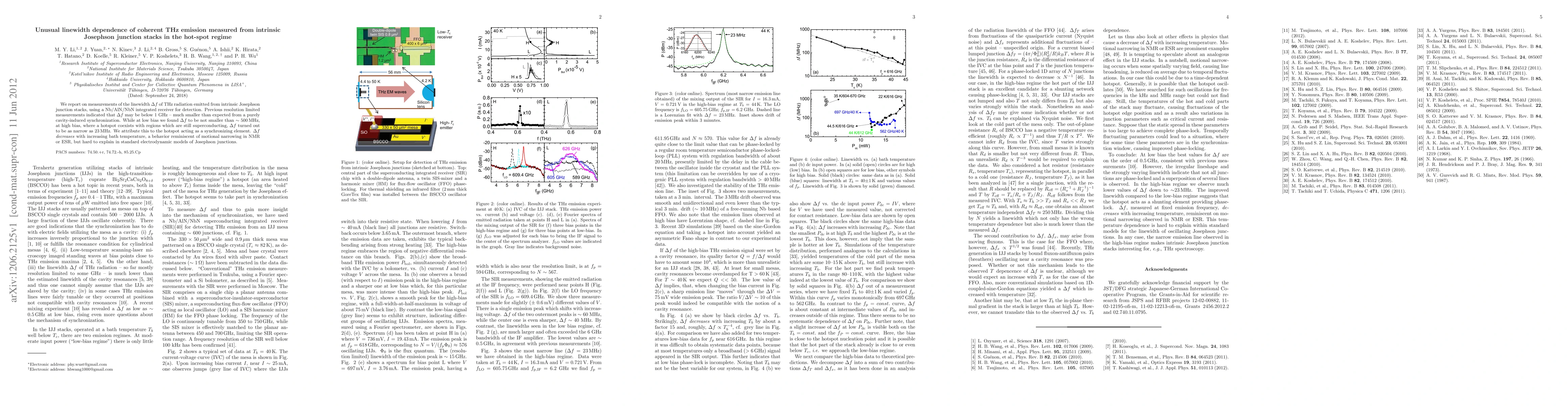This paper investigates the linewidth {\Delta}f of THz radiation emitted from intrinsic Josephson junction stacks, finding it narrows to 23 MHz under high bias conditions. The hotspot mechanism is proposed as the reason for this unusual linewidth dependence, challenging standard electrodynamic models.