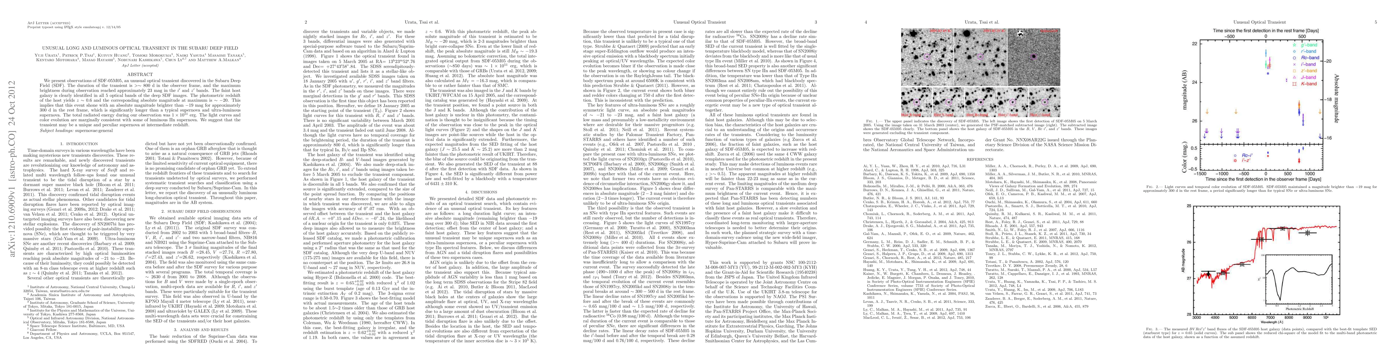 We present observations of SDF-05M05, an unusual optical transient discovered in the Subaru Deep Field (SDF). The duration of the transient is > ~800 d in the observer frame, and the maximum brightness during observation reached approximately 23 mag in the i' and z' bands. The faint host galaxy is clearly identified in all 5 optical bands of the deep SDF images. The photometric redshift of the host yields z~0.6 and the corresponding absolute magnitude at maximum is ~-20. This implies that this event shone with an absolute magnitude brighter than -19 mag for approximately 300 d in the rest frame, which is significantly longer than a typical supernova and ultra-luminous supernova. The total radiated energy during our observation was 1x10^51 erg. The light curves and color evolution are marginally consistent with some of luminous IIn supernova. We suggest that the transient may be a unique and peculiar supernova at intermediate redshift.