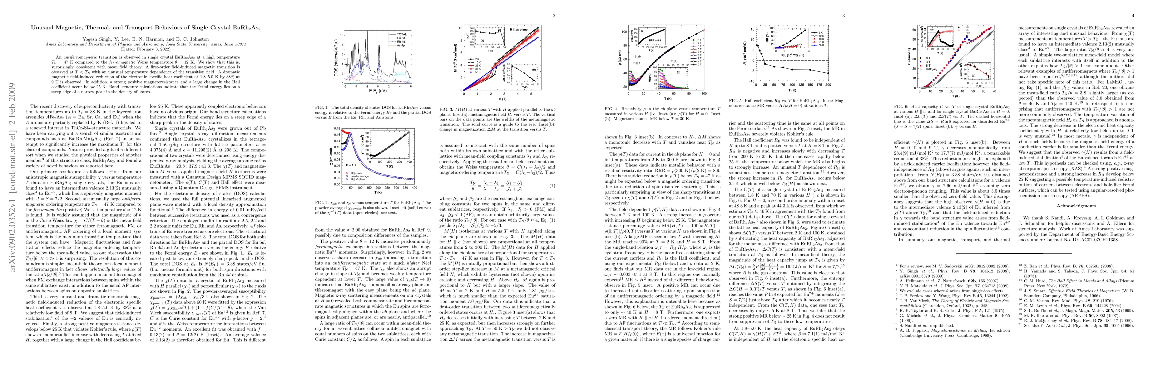 An antiferromagnetic transition is observed in single crystal EuRh2As2 at a high temperature T_N = 47 K compared to the ferromagnetic Weiss temperature theta = 12 K. We show that this is, surprisingly, consistent with mean field theory. A first-order field-induced magnetic transition is observed at T < T_N with an unusual temperature dependence of the transition field. A dramatic magnetic field-induced reduction of the electronic specific heat coefficient at 1.8-5.0 K by 38% at 9 T is observed. In addition, a strong positive magnetoresistance and a large change in the Hall coefficient occur below 25 K. Band structure calculations indicate that the Fermi energy lies on a steep edge of a narrow peak in the density of states.