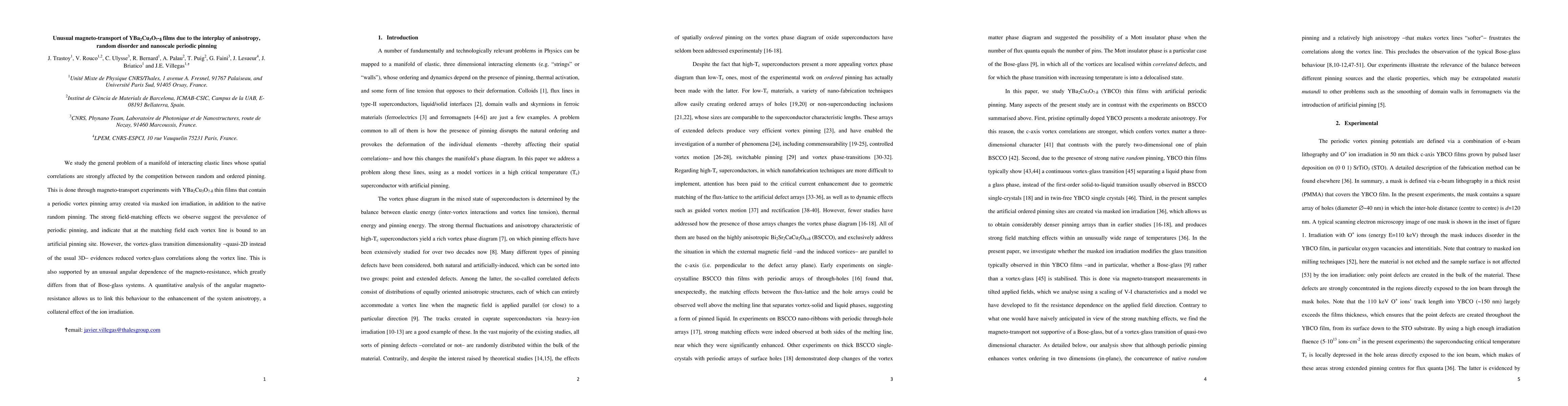 We study the general problem of a manifold of interacting elastic lines whose spatial correlations are strongly affected by the competition between random and ordered pinning. This is done through magneto-transport experiments with YBa2Cu3O7-d thin films that contain a periodic vortex pinning array created via masked ion irradiation, in addition to the native random pinning. The strong field-matching effects we observe suggest the prevalence of periodic pinning, and indicate that at the matching field each vortex line is bound to an artificial pinning site. However, the vortex-glass transition dimensionality, quasi-2D instead of the usual 3D, evidences reduced vortex-glass correlations along the vortex line. This is also supported by an unusual angular dependence of the magneto-resistance, which greatly differs from that of Bose-glass systems. A quantitative analysis of the angular magnetoresistance allows us to link this behaviour to the enhancement of the system anisotropy, a collateral effect of the ion irradiation.