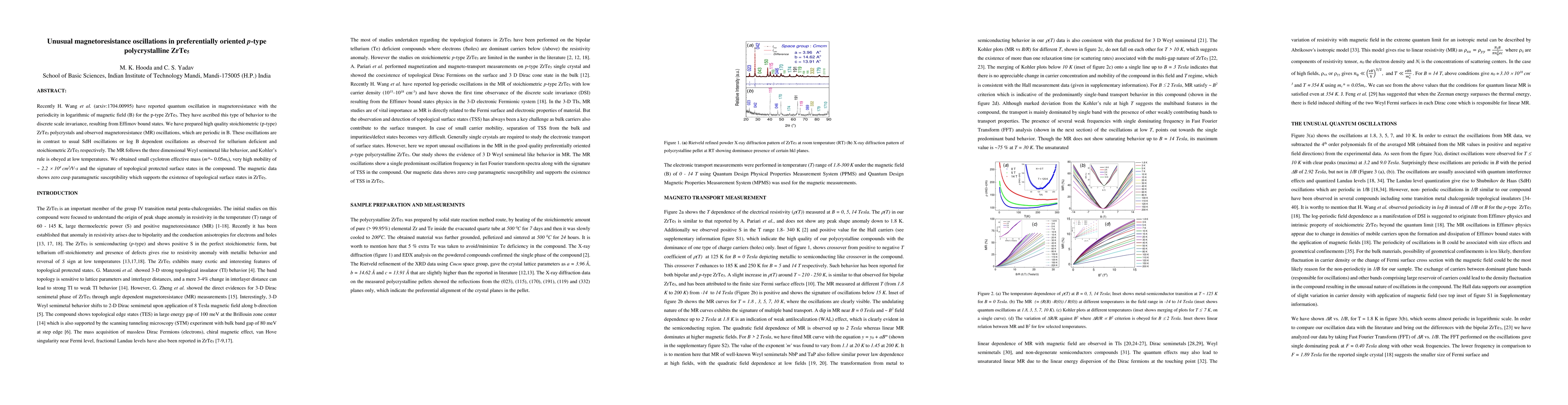 Recently H. Wang et al. (arXiv 1704.00995) have reported quantum oscillation in magnetoresistance with the periodicity in logarithmic of magnetic field (B) for the p-type ZrTe5. They have ascribed this type of behavior to the discrete scale invariance, resulting from Effimov bound states. We have prepared high quality stoichiometric (p-type) ZrTe5 polycrystals and observed magnetoresistance (MR) oscillations, which are periodic in B. These oscillations are in contrast to usual SdH oscillations or log B dependent oscillations as observed for tellurium deficient and stoichiometric ZrTe5 respectively. The MR follows the three dimensional Weyl semimetal like behavior, and Kohler's rule is obeyed at low temperatures. We obtained small cyclotron effective mass (m* = 0.05 m_e), very high mobility of 2.2 X 10^4 cm^2/V.s and the signature of topological protected surface states in the compound. The magnetic data shows zero cusp paramagnetic susceptibility which supports the existence of topological surface states in ZrTe5.