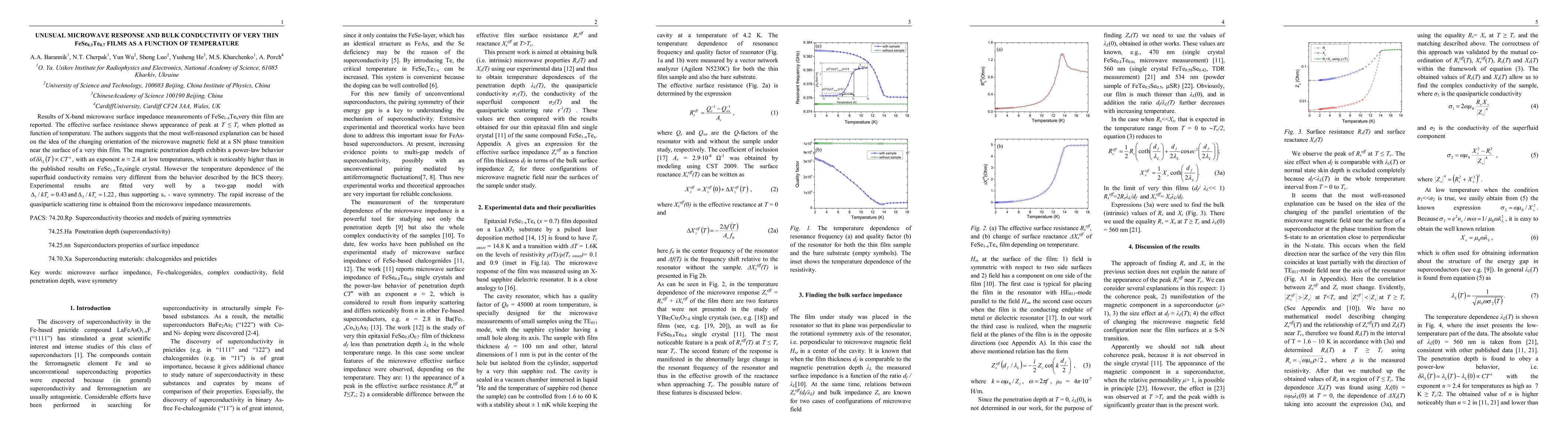 This study investigates the microwave response and bulk conductivity of very thin FeSe0.3Te0.7 films, revealing a peak in effective surface resistance near the critical temperature Tc, indicative of a SN phase transition. The magnetic penetration depth follows a power-law behavior, and the results support a two-gap model with s(+-)-wave symmetry, differing from BCS theory predictions.