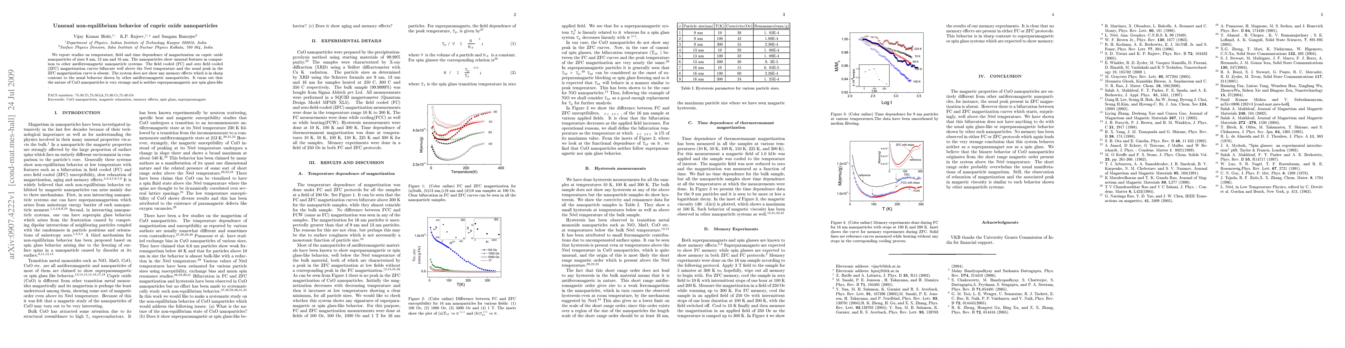 This study investigates the unusual non-equilibrium behavior of cupric oxide nanoparticles, revealing bifurcation in magnetization curves above the Neel temperature and absence of a typical peak in zero field cooled curves. Unlike other antiferromagnetic nanoparticles, these CuO nanoparticles lack memory effects and do not fit into superparamagnetic or spin glass categories.
