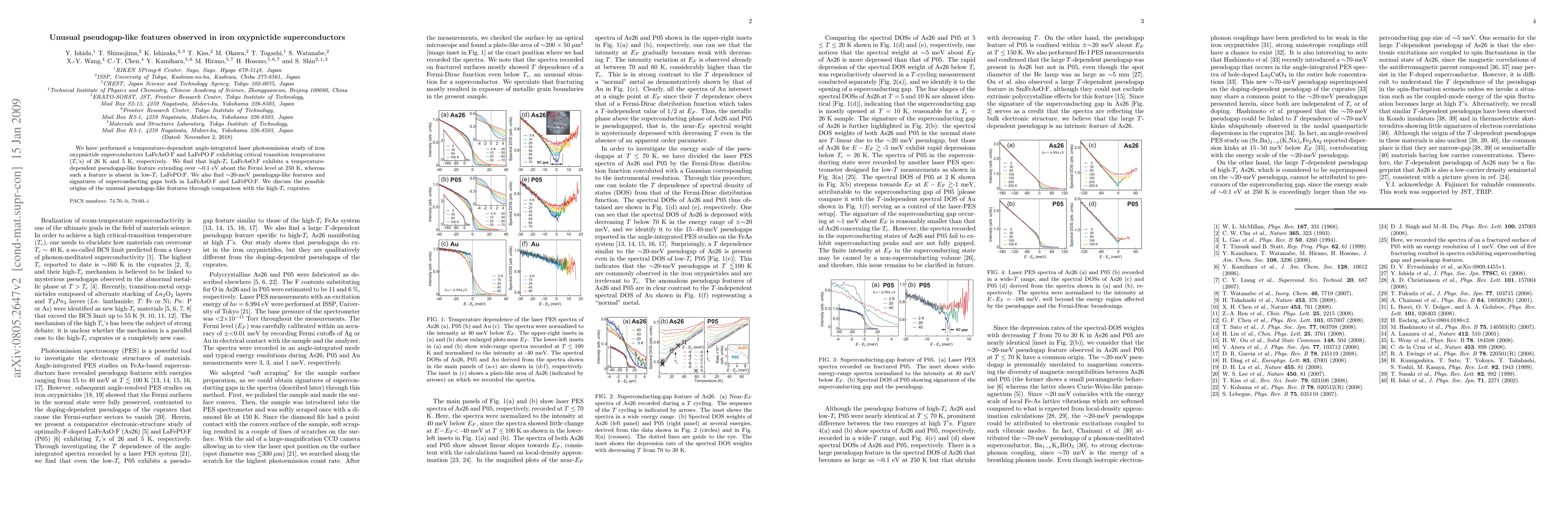 This study reveals temperature-dependent pseudogap-like features in high-temperature iron oxypnictide superconductor LaFeAsO:F, absent in low-temperature LaFePO:F, alongside signatures of superconducting gaps in both materials. The origins of these pseudogaps are explored by comparing with high-Tc cuprates.