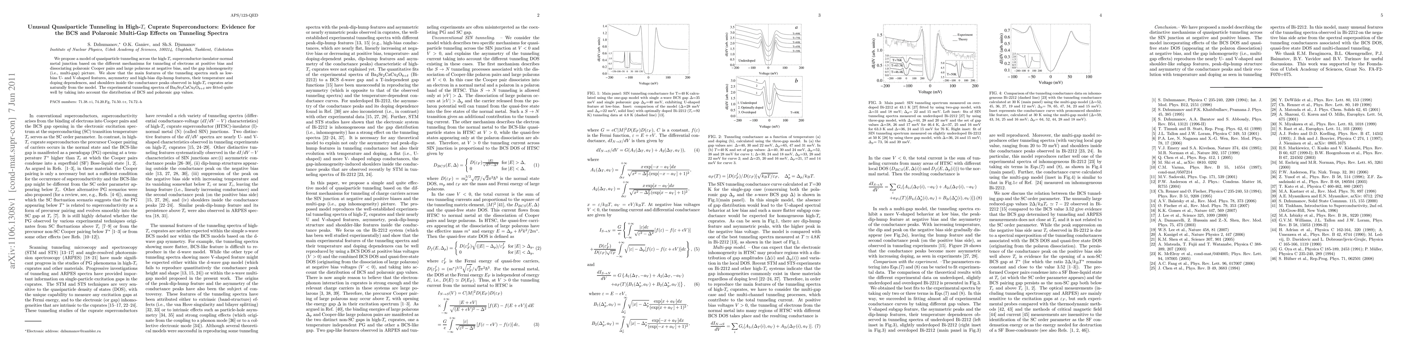 This paper proposes a quasiparticle tunneling model for high-$T_c$ cuprate superconductors, explaining unusual tunneling spectra through BCS and polaronic multi-gap effects. The model fits experimental data from $\rm{Ba_2Sr_2CaCu_2O_{8+\delta}}$, capturing features like U- and V-shaped features and high-bias dip-hump structures.