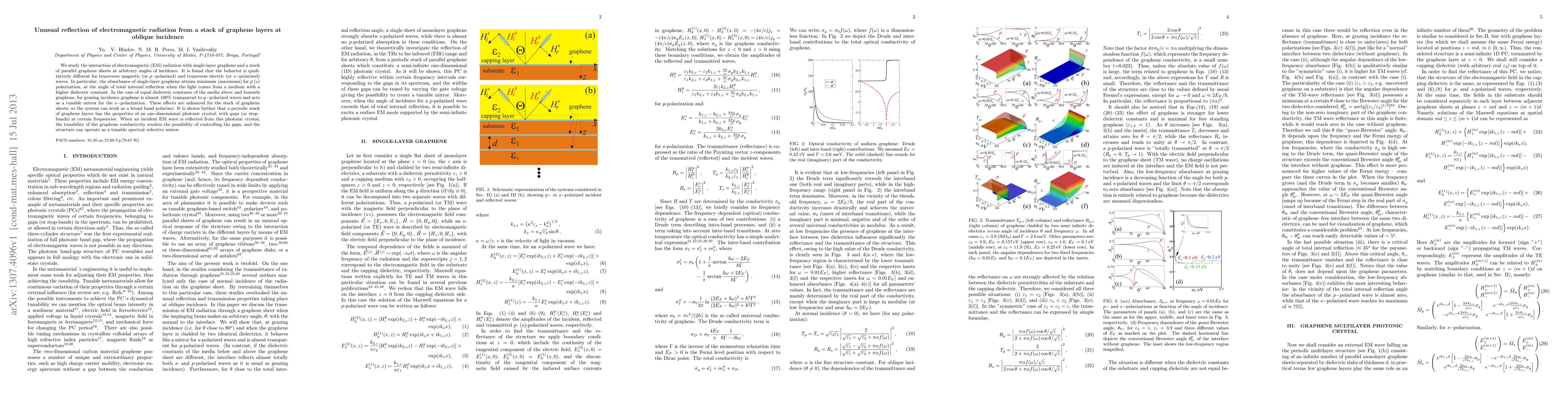 This paper investigates the unique reflection behavior of electromagnetic radiation from a stack of graphene layers at oblique incidence, revealing distinct interactions for p-polarized and s-polarized waves. The study finds that graphene acts as a tunable mirror for s-polarization and can function as a broadband polarizer and a tunable spectral-selective mirror due to its photonic crystal properties.