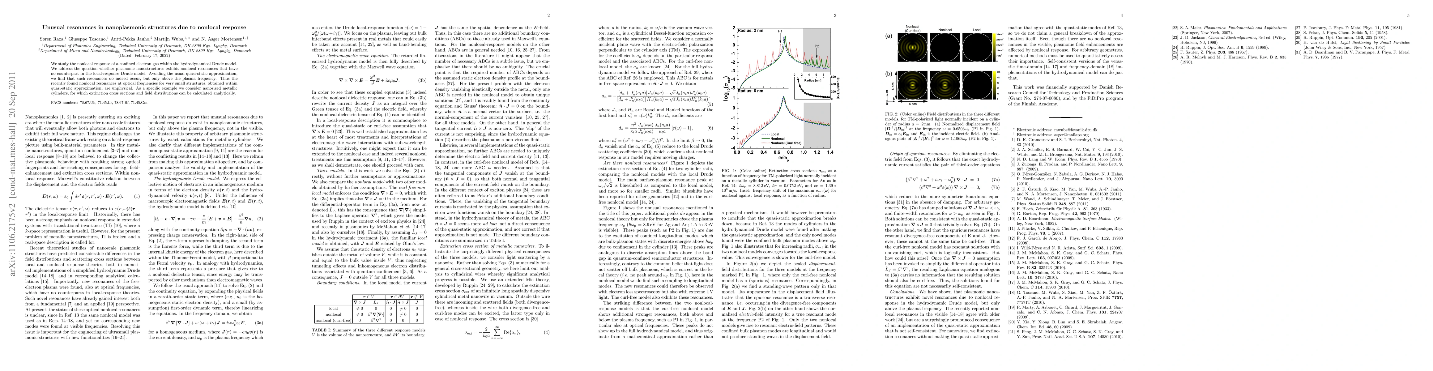 This paper investigates the nonlocal response of confined electron gas in nanoplasmonic structures, revealing unusual resonances only above the plasma frequency, challenging the validity of quasi-static approximation findings. Specifically, it analytically examines metallic nanocylinders, demonstrating that nonlocal resonances previously found at optical frequencies are unphysical.