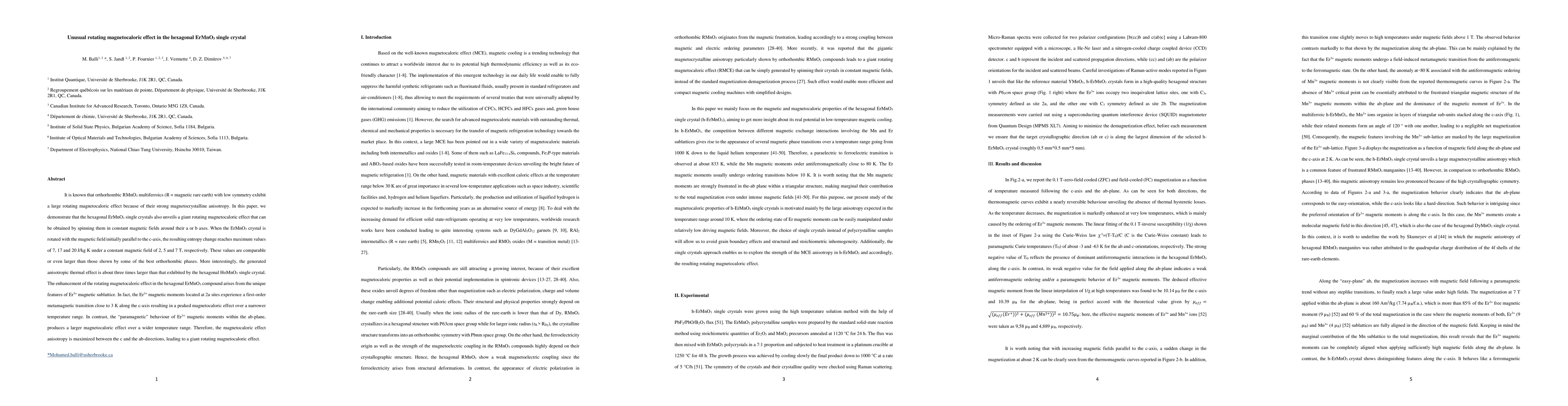 This paper demonstrates that hexagonal ErMnO3 single crystals exhibit a significant rotating magnetocaloric effect, with entropy changes reaching up to 20 J/kg K under a 7 T magnetic field, comparable to the best orthorhombic phases. The unique magnetic anisotropy of Er3+ sublattices enhances this effect, resulting in a three times larger thermal effect than in HoMnO3.