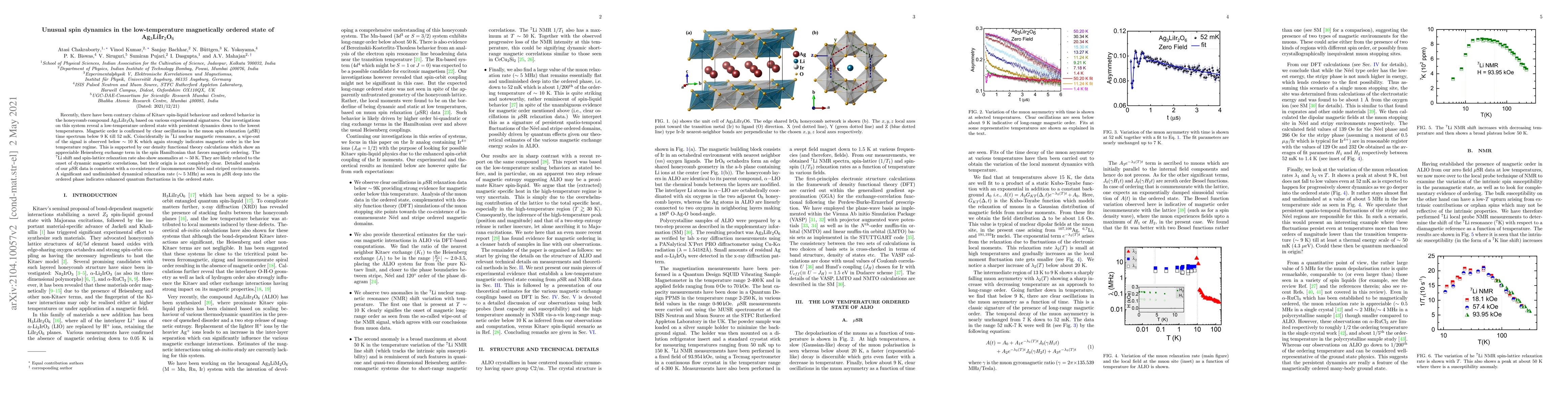This study investigates the magnetic state of Ag$_3$LiIr$_2$O$_6$, revealing a low-temperature ordered phase with persistent spin dynamics confirmed by muon spin relaxation and $^7$Li NMR. The coexistence of incommensurate N\'eel and striped magnetic environments, along with enhanced quantum fluctuations, suggests unusual spin dynamics in the ordered state.