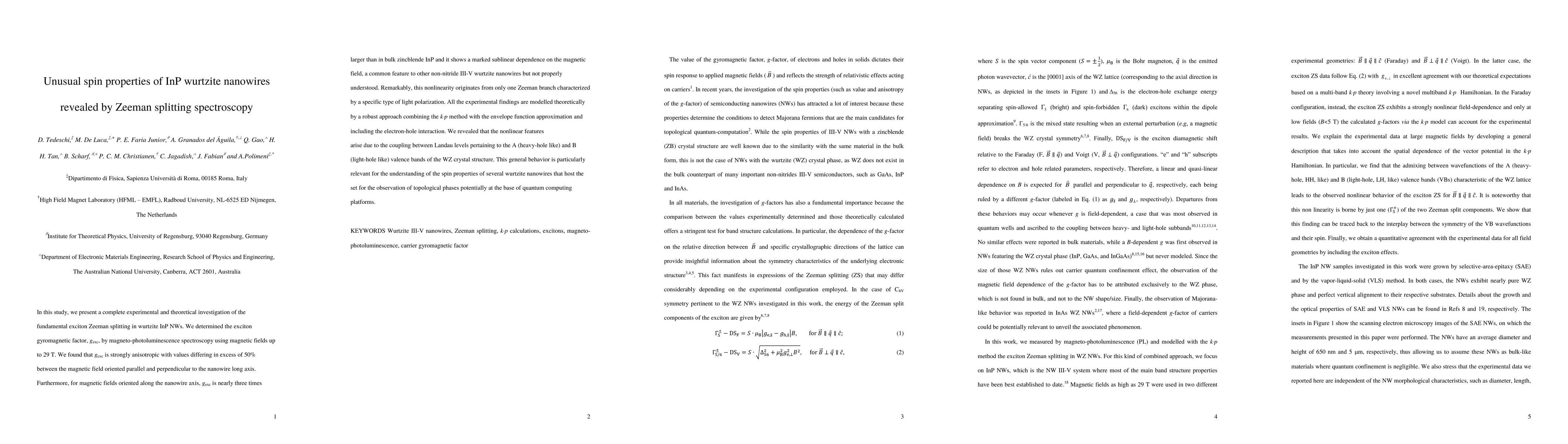 This research reveals strong anisotropy in the gyromagnetic factor of excitons in wurtzite InP nanowires, with values differing by over 50% based on magnetic field orientation. The nonlinear Zeeman splitting, not observed in bulk material, is attributed to coupling between Landau levels of heavy- and light-hole valence bands, suggesting implications for topological spin properties in quantum computing.