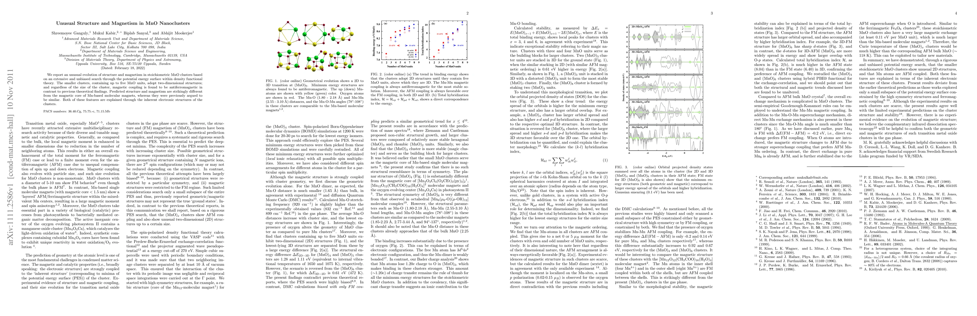 This study reveals that MnO nanoclusters up to five units in size exhibit two-dimensional structures and antiferromagnetic coupling, contrary to earlier theoretical predictions. These findings diverge from the magnetism of Mn-based molecular magnets due to the unique electronic structures of the clusters.