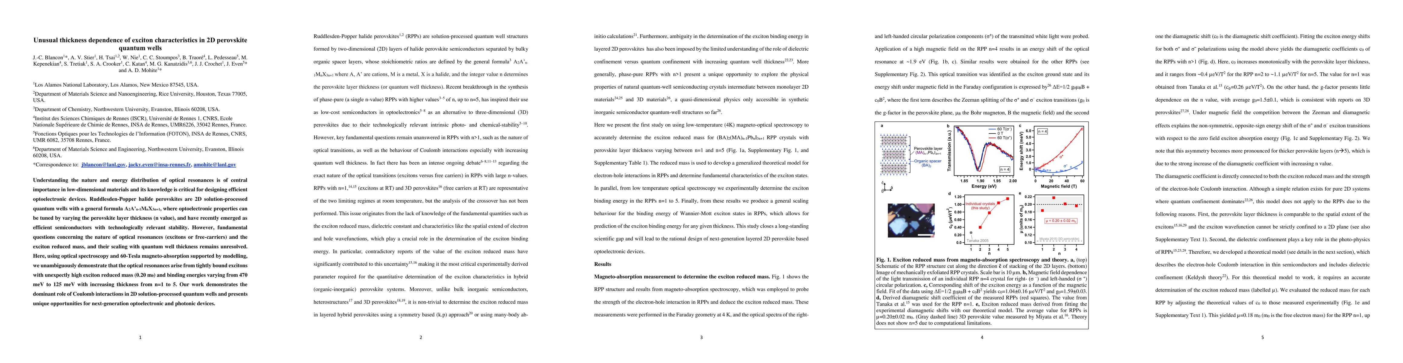 This study reveals that optical resonances in 2D perovskite quantum wells are dominated by tightly bound excitons with high reduced mass and binding energies that decrease with increasing layer thickness. The findings highlight the significant role of Coulomb interactions and suggest potential for advanced optoelectronic applications.