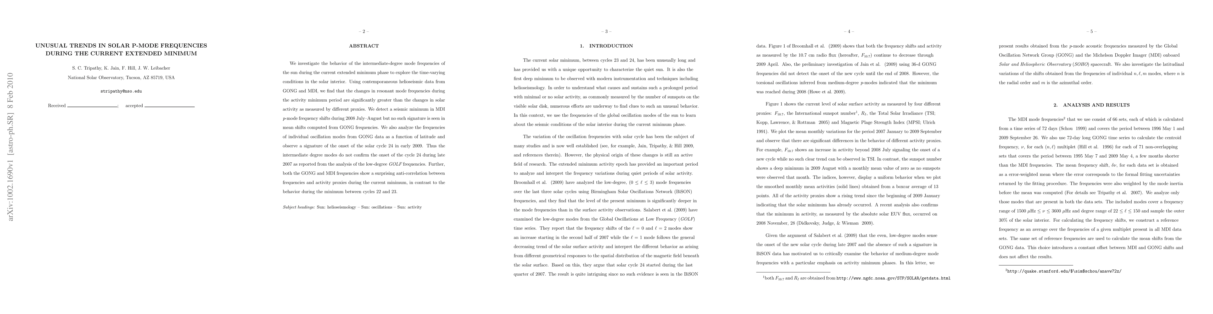 This study examines solar p-mode frequencies during the current extended solar minimum, revealing significant changes in intermediate-degree modes that exceed typical solar activity variations. An unexpected anti-correlation between frequency shifts and activity proxies is observed, contrasting with previous minimum periods.