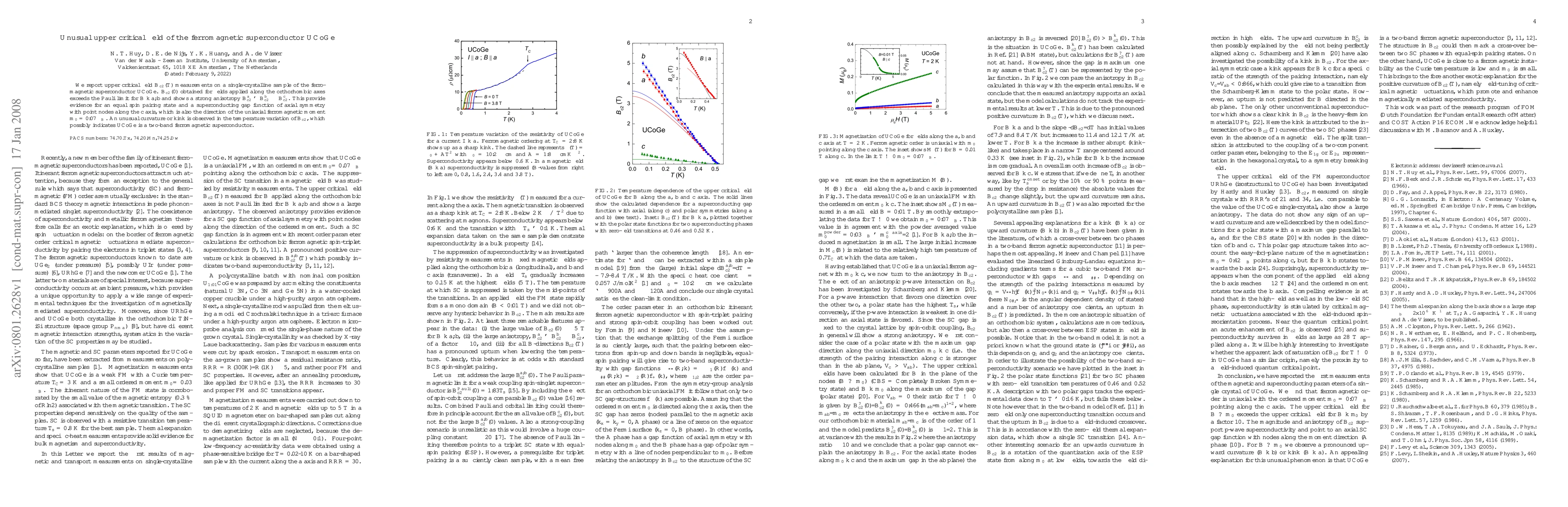 The paper presents detailed upper critical field measurements and their analysis on a single-crystalline UCoGe sample, providing evidence for an equal spin pairing state and axial symmetry of the superconducting gap function.