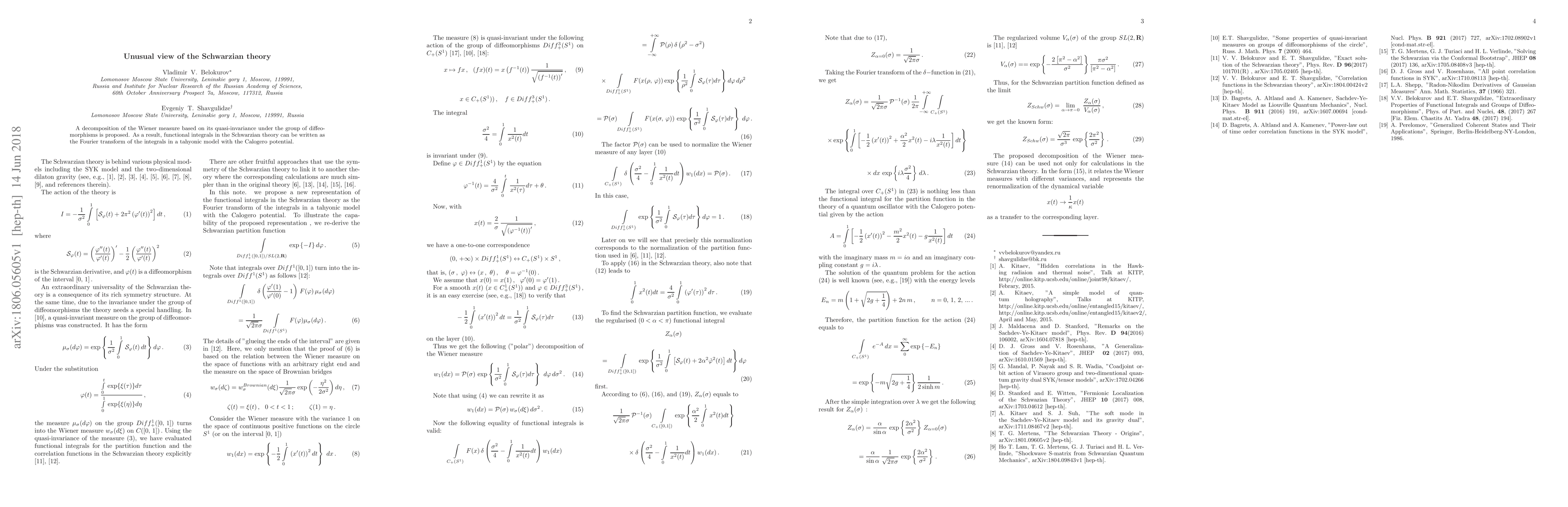 A decomposition of the Wiener measure based on its quasi-invariance under the group of diffeo- morphisms is proposed. As a result, functional integrals in the Schwarzian theory can be written as the Fourier transform of the integrals in a tahyonic model with the Calogero potential.